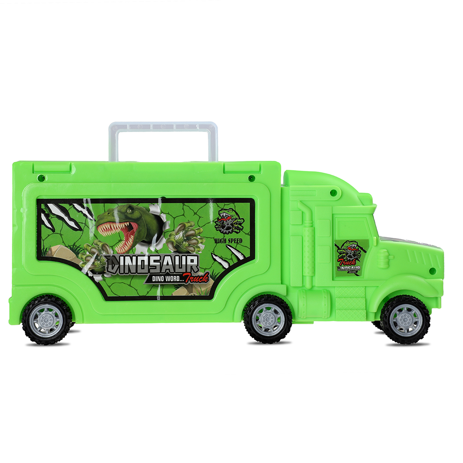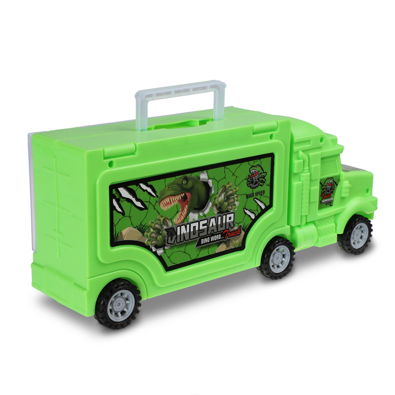Машинка выполнена в виде трейлера, который предназначен для перевозки динозавров.