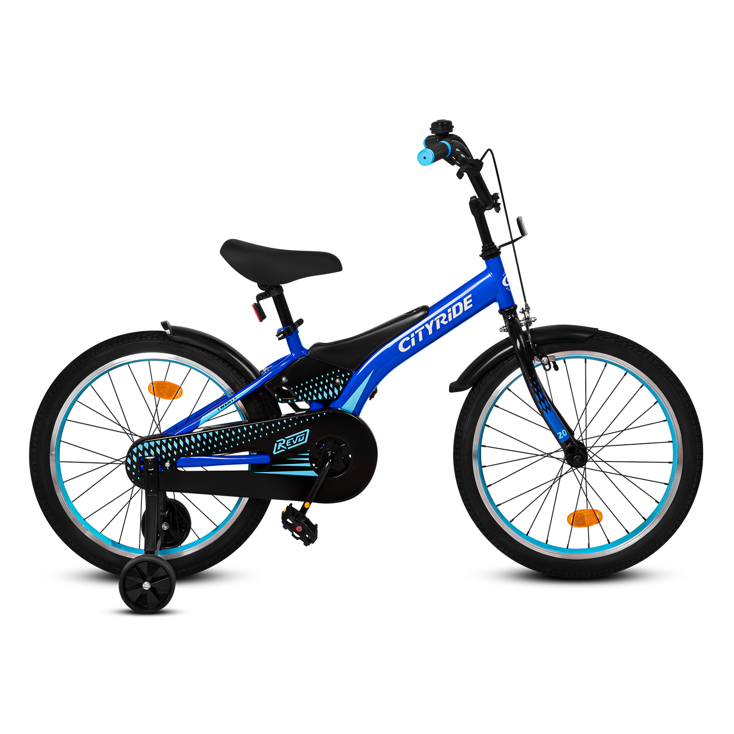 Детский велосипед "Cityride REVO" -рама сталь, кожух цепи 100%, диски алюм. 20, втулки сталь, покрышки 2,125, страх. колеса, руль сталь. штем сталь, задние ножные тормоза, передний V-brake , звоночек, крылья пластик, отражатели пер/зад на спицах.