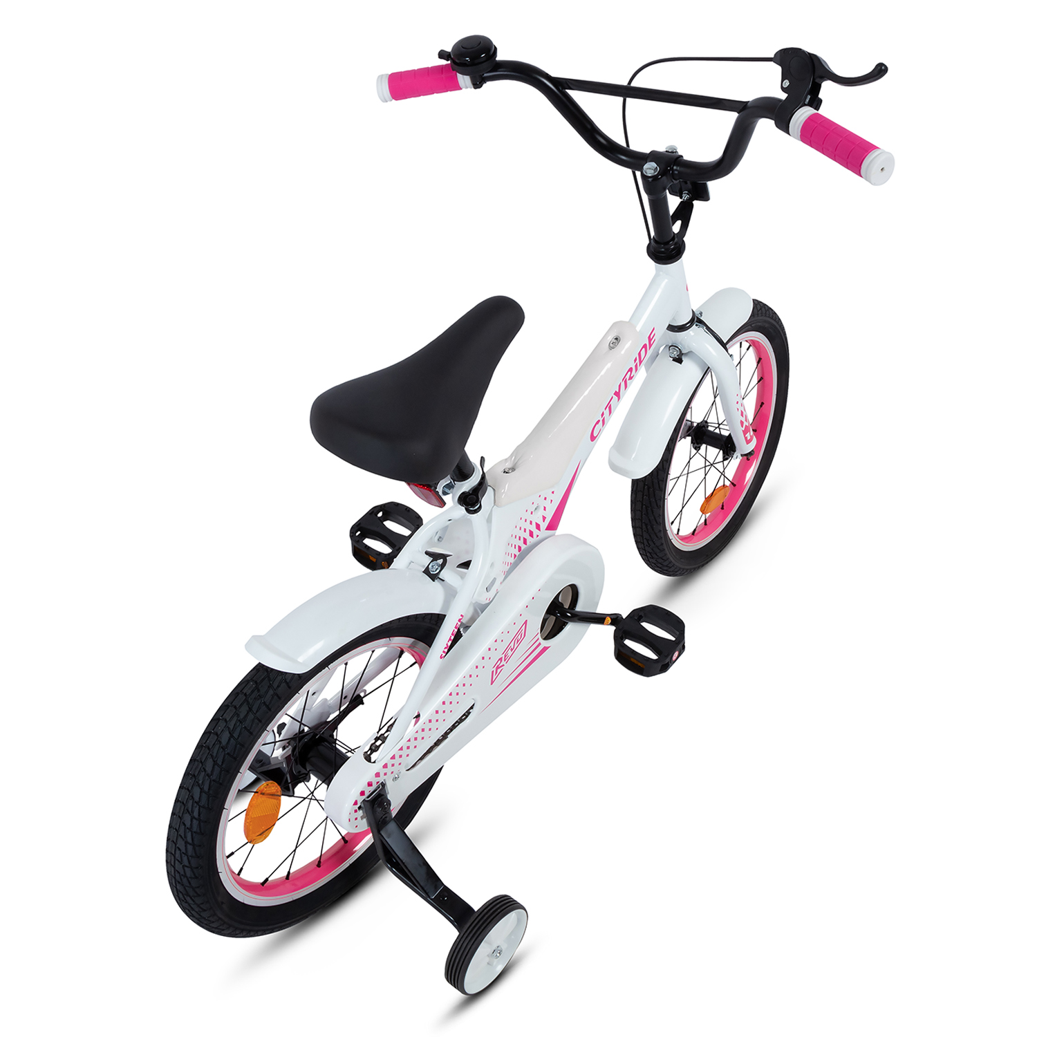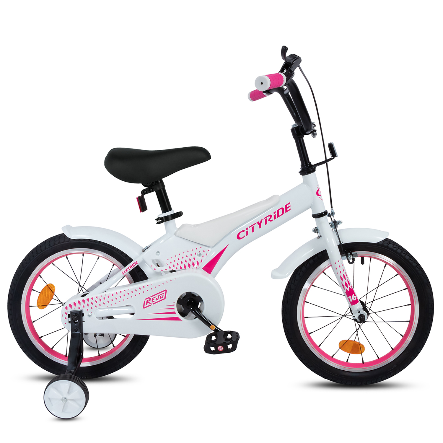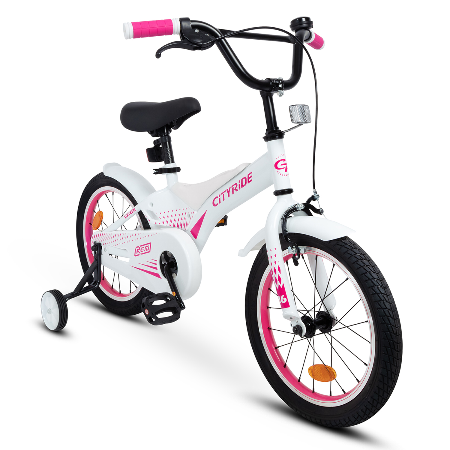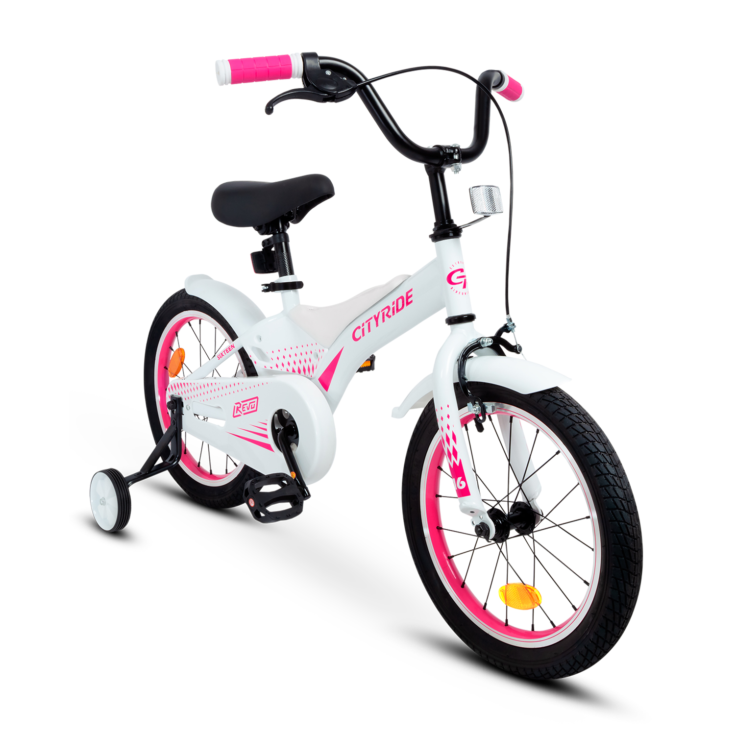 Детский велосипед "Cityride REVO", модель CR-B2-05, рама сталь, кожух цепи 100%, обода алюм. 16", втулки сталь, покрышки 2,125, страх. колеса, руль сталь. вынос сталь, задние ножные тормоза, передний клещевой, крылья пластик, отражатели пер/зад и на спицах, цвет белый розовый