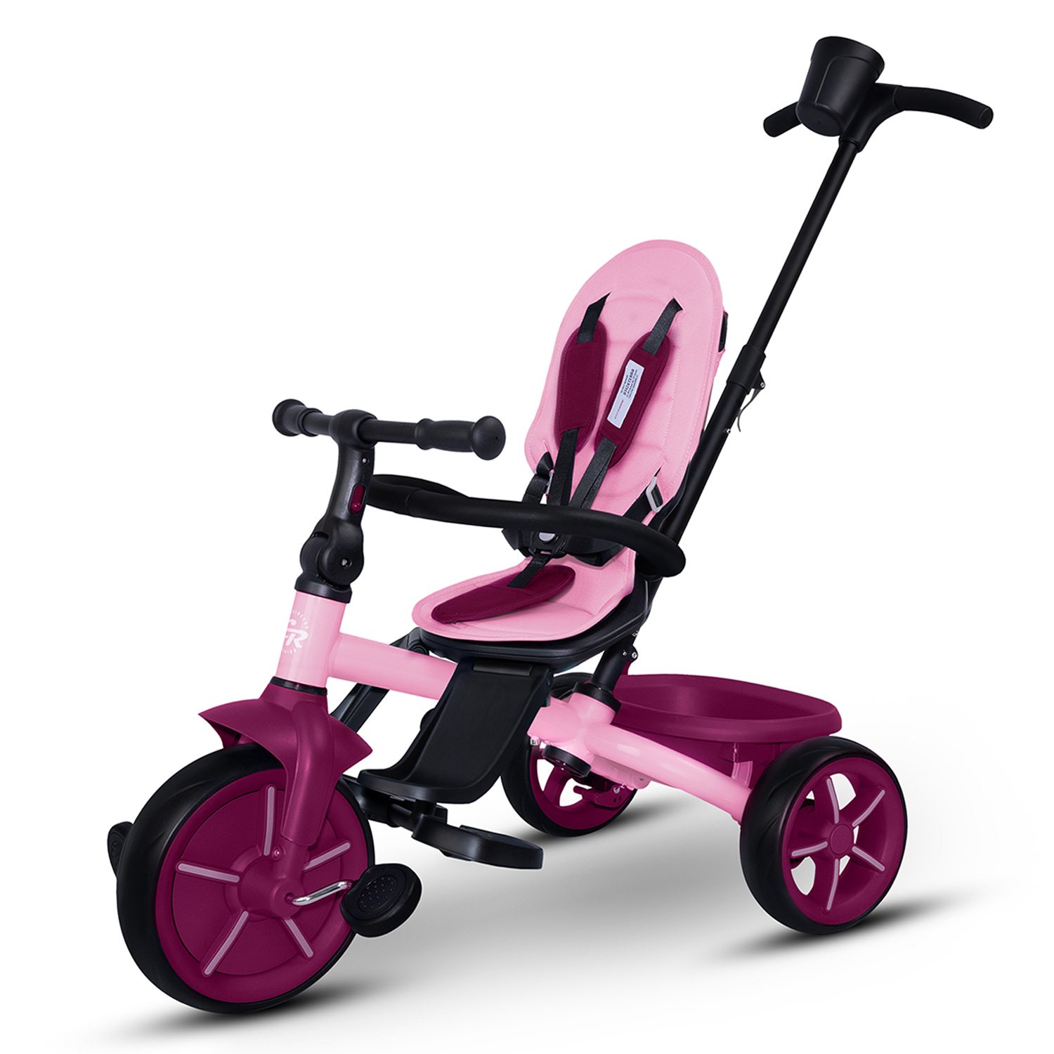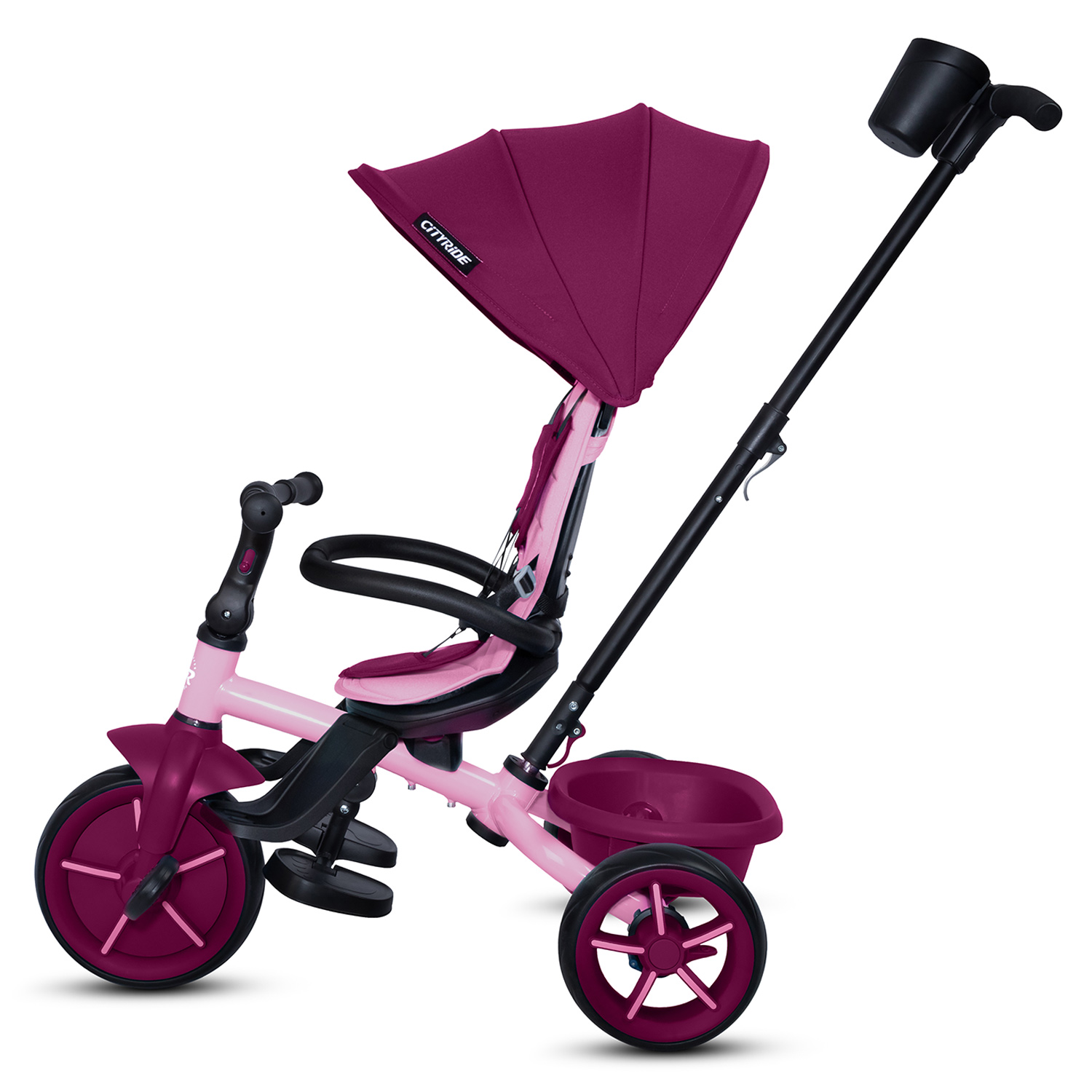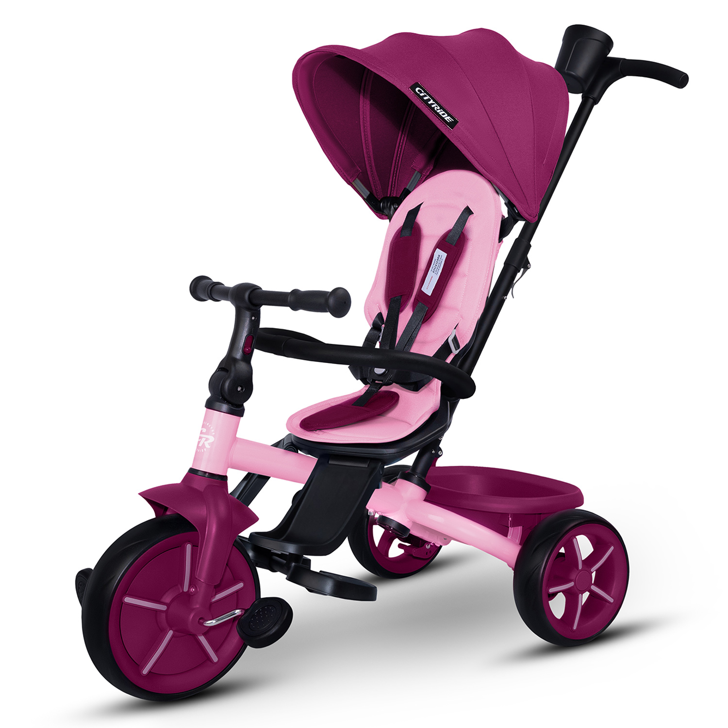 Детский трехколесный велосипед "CITYRIDE XTERRA". Рама сталь, сиденье съемное, складная крыша D600, подножки, колеса 11/9 EVA, корзина, подстаканник, розовый