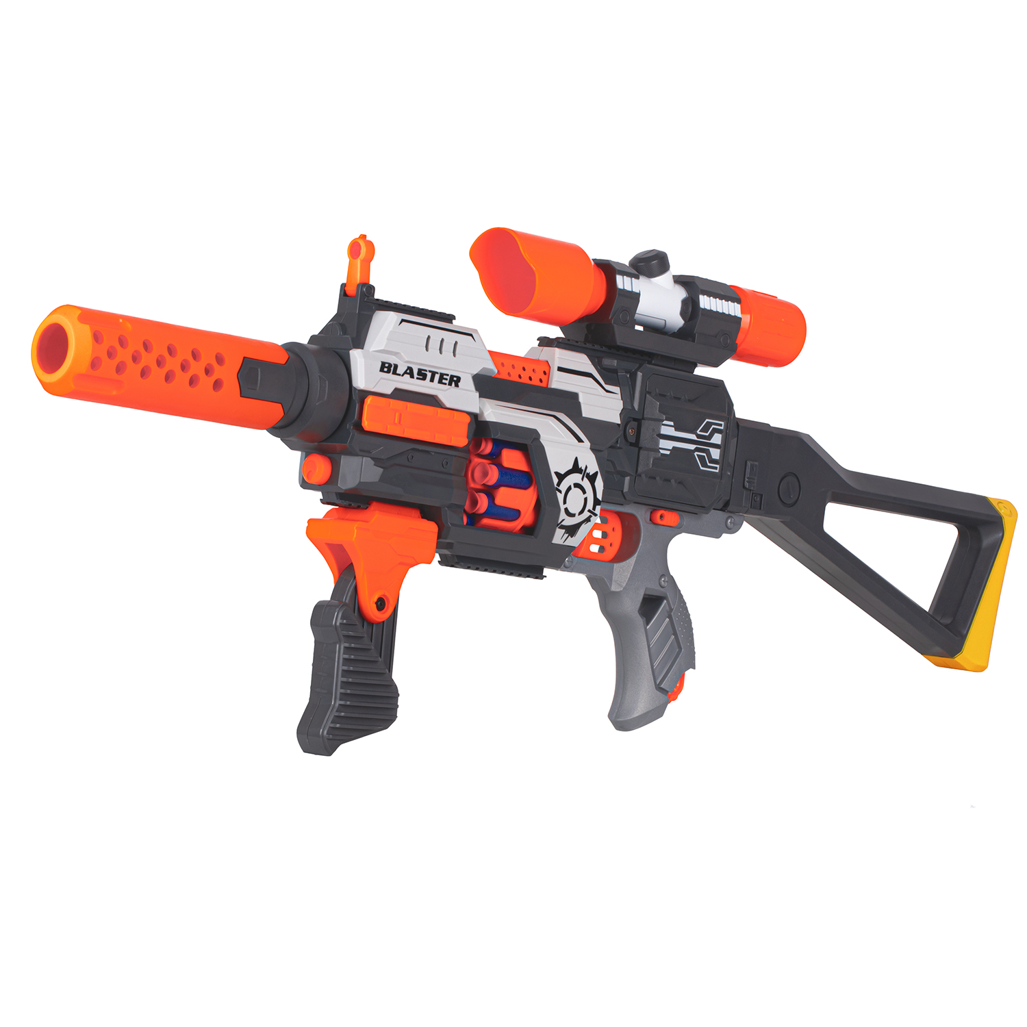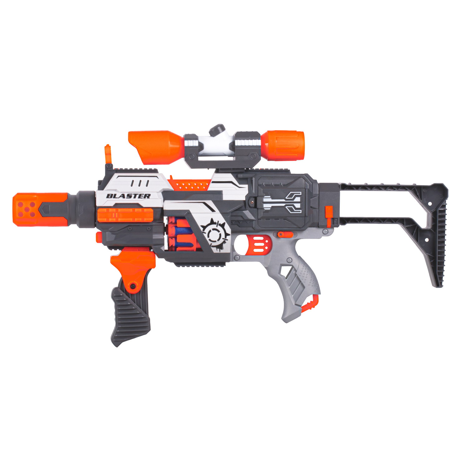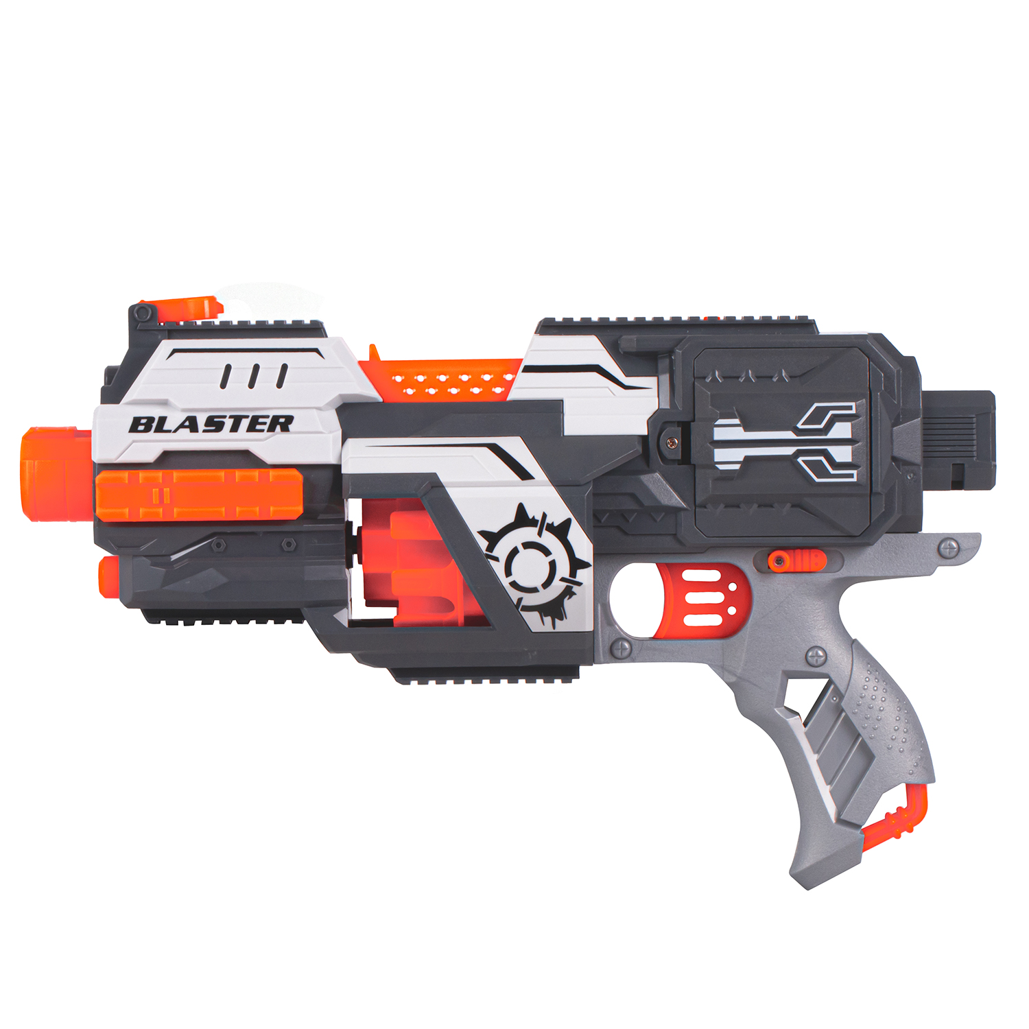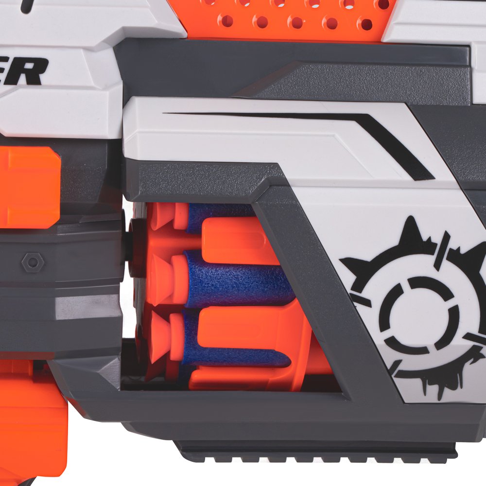В комплект входит 30 пуль с присосками. Взвод производится автоматически, бластер работает от батареек. Игрушечный бластер прост в применении: пули вставляются в барабанный магазин, переключатель на стволе переводится в положение «ON», затем нажимается курок для совершения выстрела.