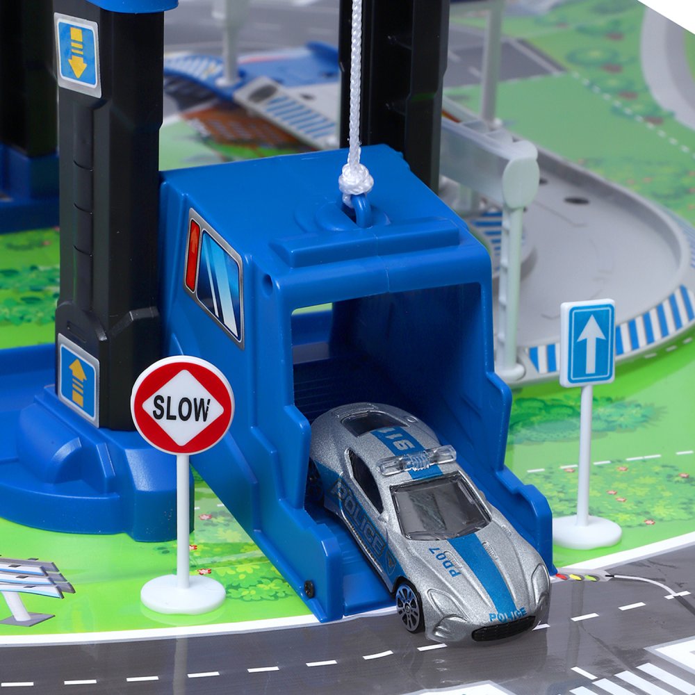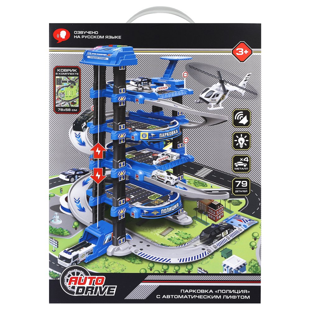 AUTODRIVE Парковка "Полиция" с автоматическим лифтом, светом,звуками,озвуч.на рус.языке. В компл: металлический транспорт 4шт., игровой коврик 78*58 см