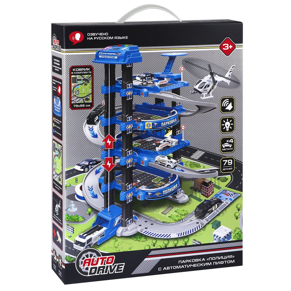 Многоуровневая парковка «Полиция» торговой марки AUTODRIVE - прекрасный подарок для маленьких автолюбителей. Четырёхэтажная парковка оборудована автоматическим лифтом, одним спуском-серпантином, шлагбаумами, специальными знаками дорожного движения, предусмотрено нанесение наклеек со спецразметкой (входят в комплект). На верхнем этаже размещена вертолетная площадка, на всех этажах расположены зоны для стоянки машинок. Металлический транспорт (3 машинки, 1 вертолет) и игровой коврик с изображением города также входят в комплект. На верхней части парковки устанавливается специальный блок, с помощью которого происходит управление лифтом (движение вверх и вниз), воспроизводятся звуки транспорта, спецсигналы и полезные советы на русском языке. Остановить лифт можно нажатием на любую кнопку. Играть с парковкой не только весело и интересно, в то же время ребенок будет развивать воображение, мелкую моторику, логику и знакомиться с правилами дорожного движения, что очень пригодится ему в будущем.