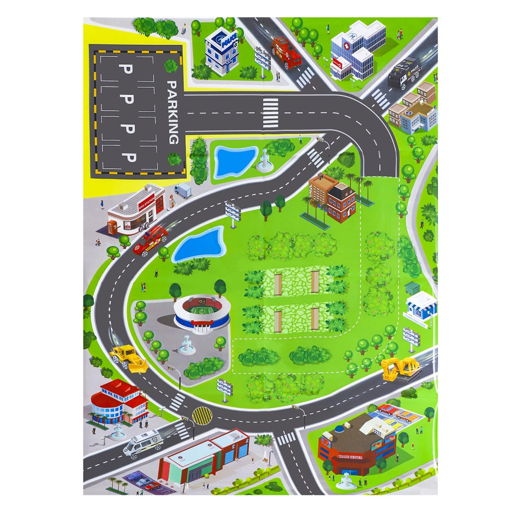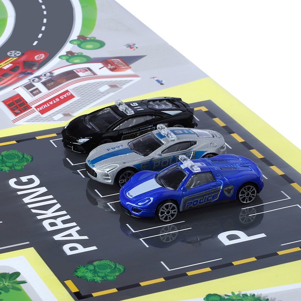 Комплектация: парковка, 3 машинки, 1 вертолет, коврик, дорожные знаки, набор наклеек.