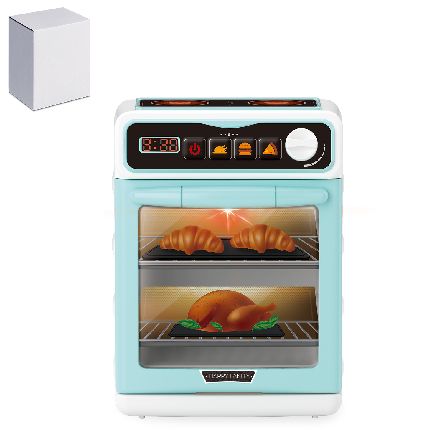Очаровательная миниатюрная копия настоящей духовки оснащена яркой подсветкой внутри, которая создает эффект настоящего приготовления блюда.