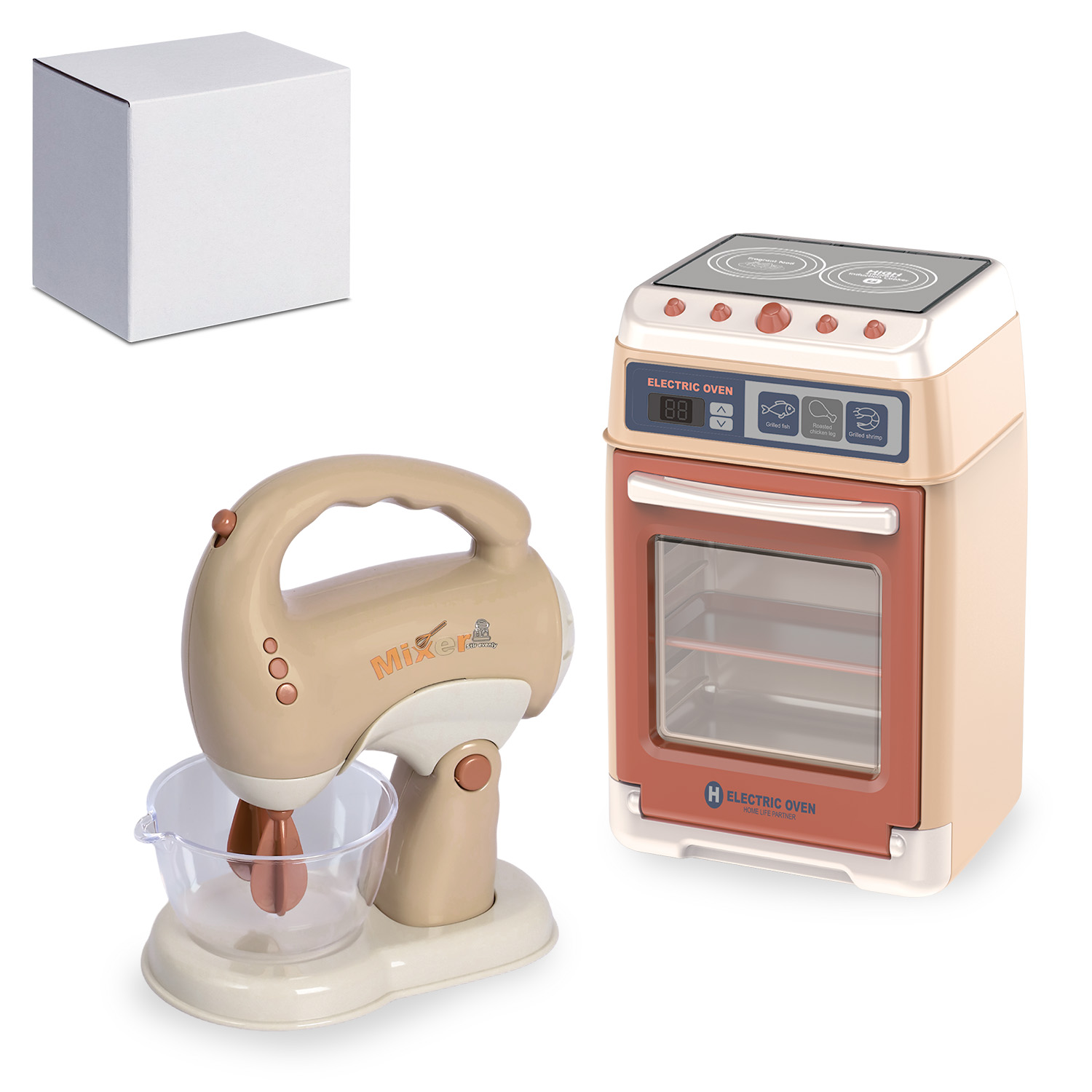 Набор игрушечной бытовой техники "Плита, миксер" бежевая, 2 шт, на бат., в б/к
