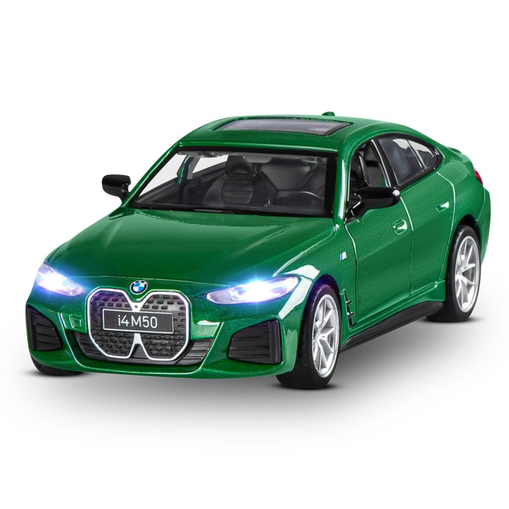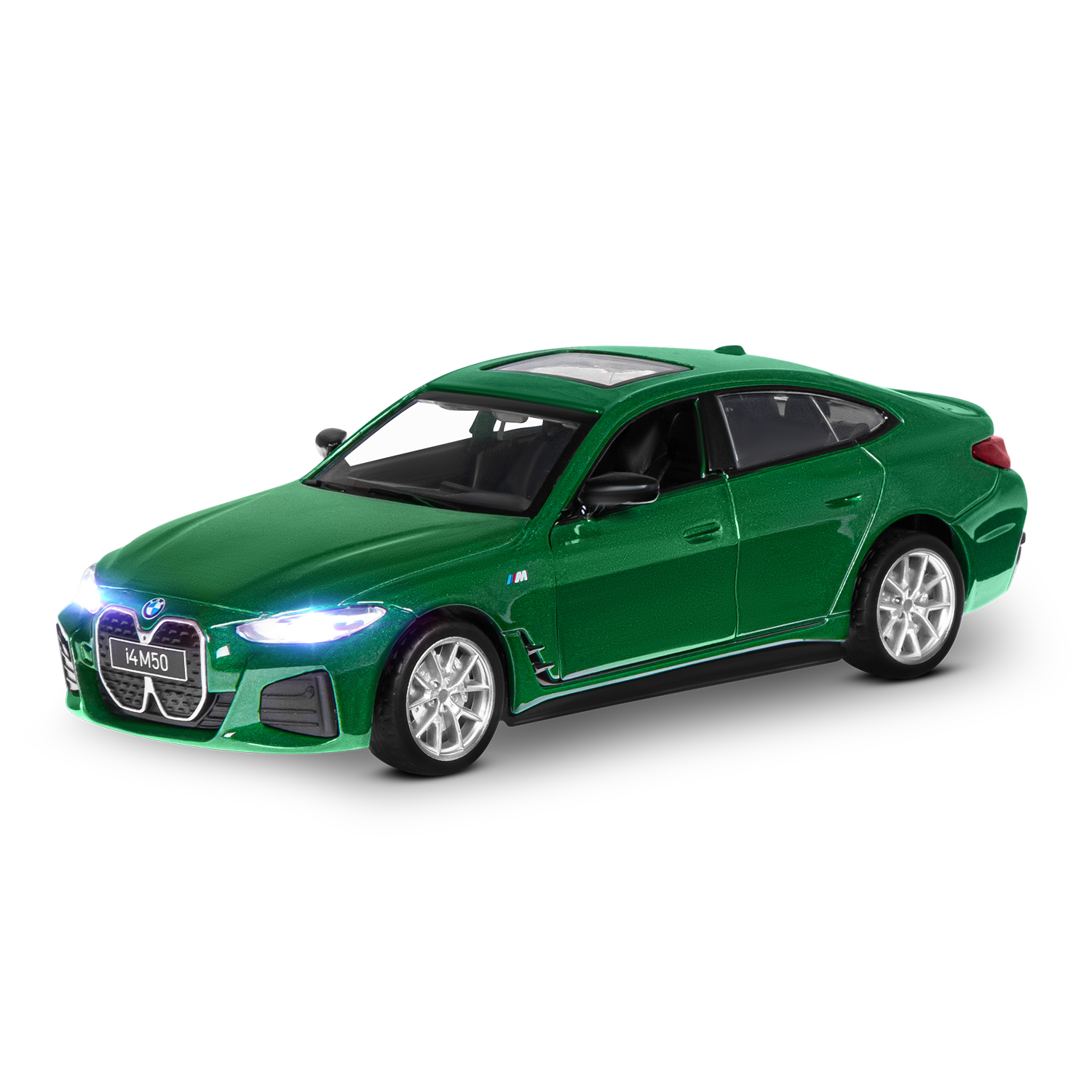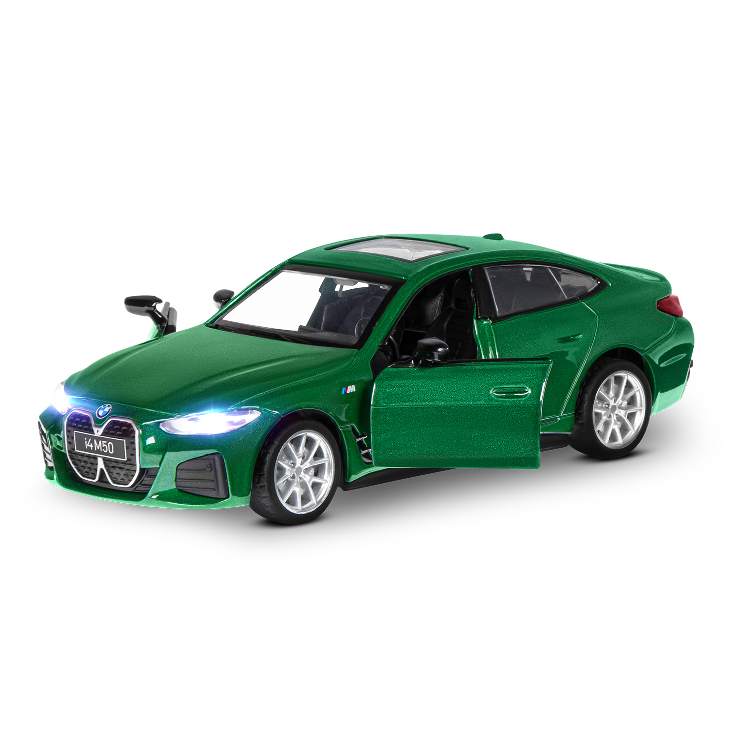 Машинка металлическая 1:34 BMW I4 M50 с зарядной станцией, зеленый, свет, звук, от
