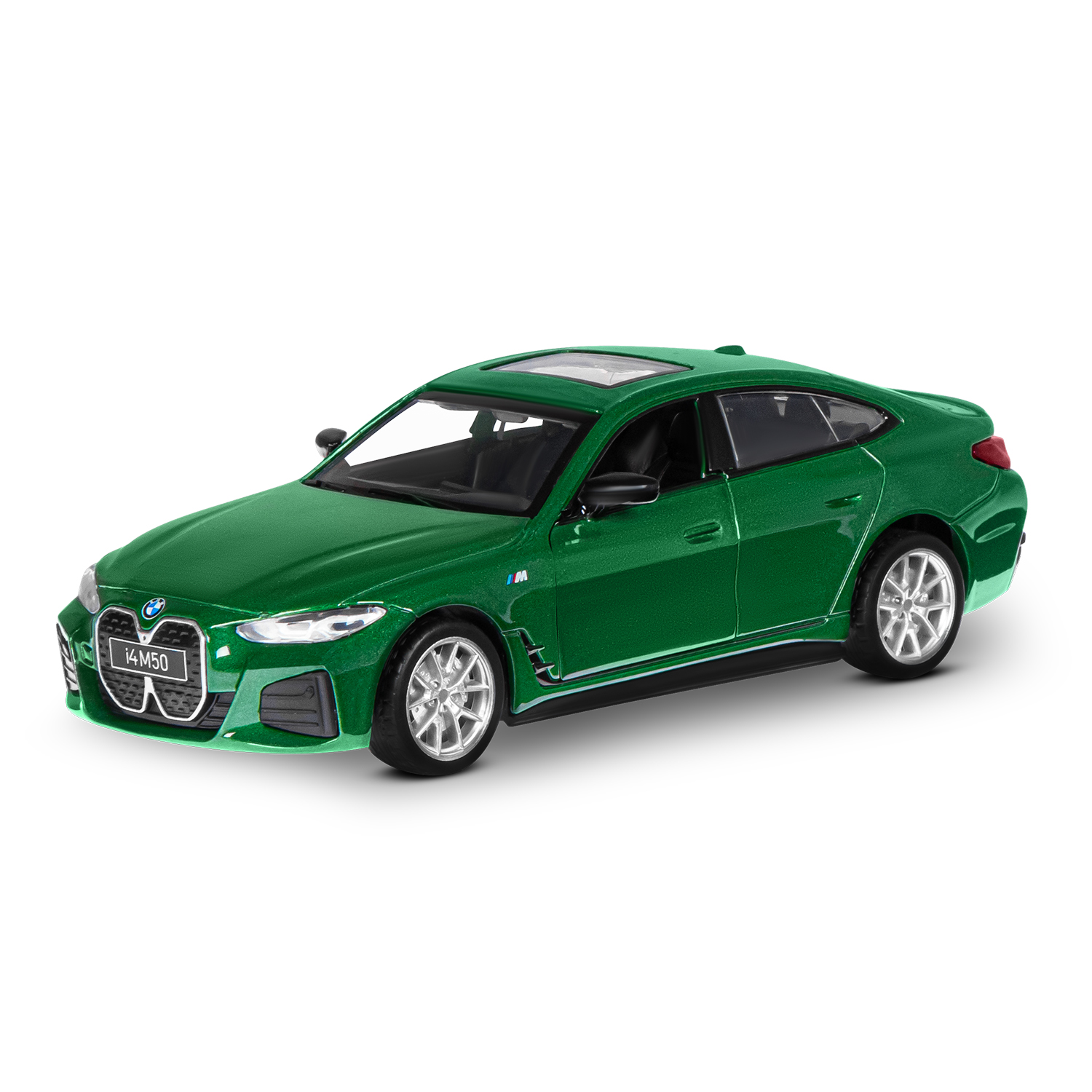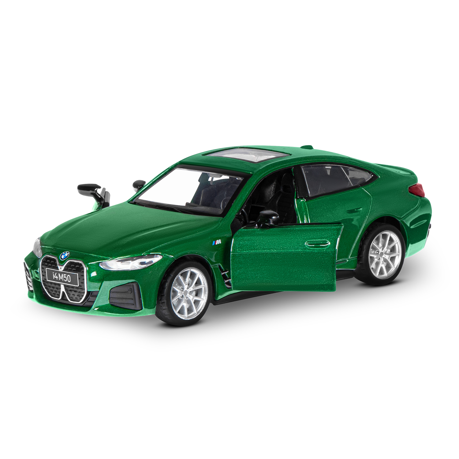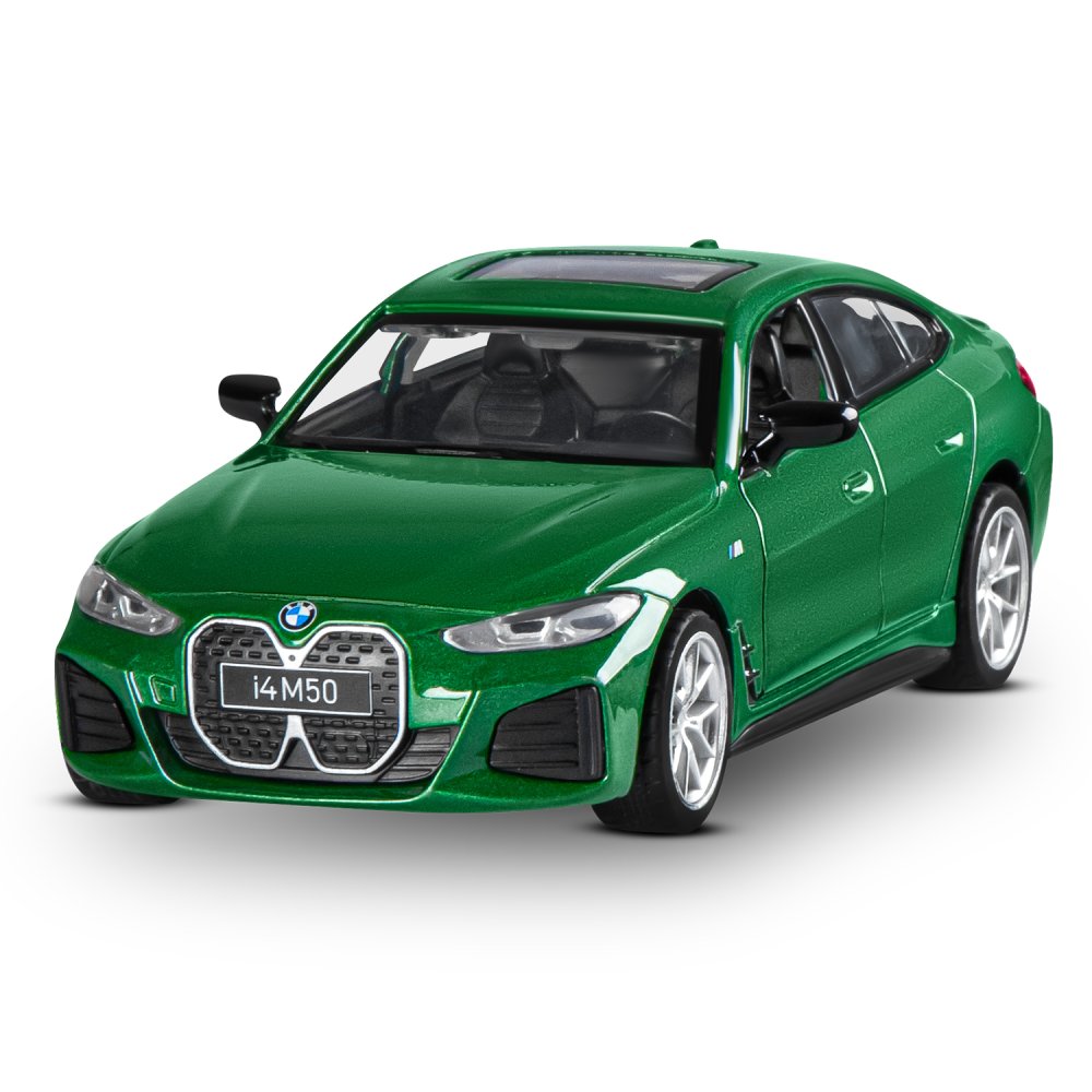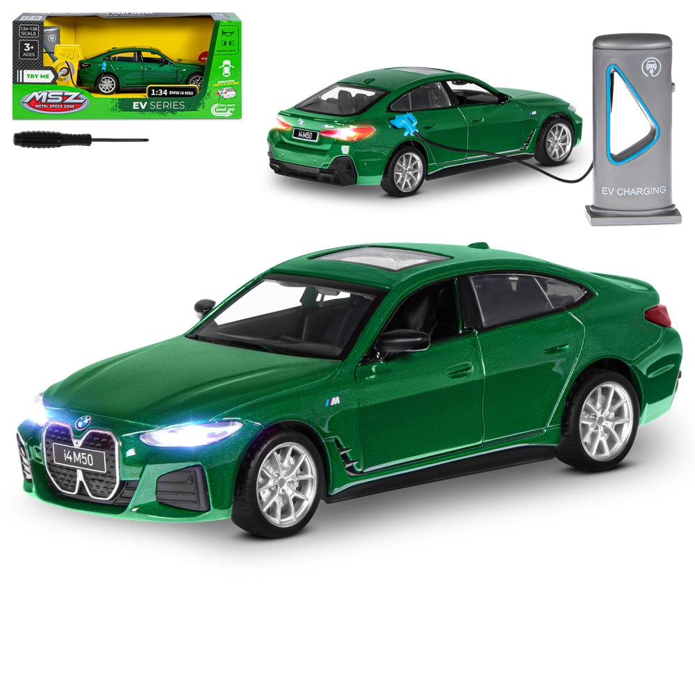 Машинка металлическая 1:34 BMW I4 M50 с зарядной станцией, зеленый, свет, звук, от