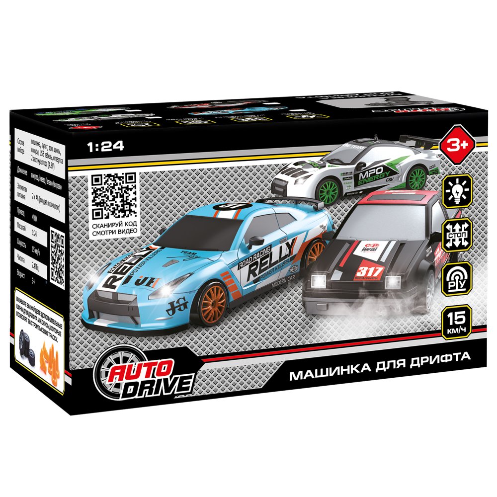 Скоростная машинка на радиоуправлении для дрифта AUTODRIVE, изготовлена из ударопрочного пластика - отличный выбор для любителей скорости и экстремального вождения. Дрифт — техника прохождения поворотов, характеризующаяся использованием управляемого заноса на максимально возможной скорости. В движении машинка развивает скорость свыше 15км/ч. Хорошо принимает сигналы профессионального пульта управления в виде пистолета. Быстро реагирует на смену команд. Благодаря светодиодным фарам, машинка может ездить в темноте. В комплекте к машине прилагаются сменные шины. В наборе также вы найдете конусы, которые позволят выстроить свою трассу. Машинка может ехать вперед, назад и поворачивать в стороны. Подходит для детей от 3 лет. Характеристики: Максимальная скорость движения: 15 км/ч Время зарядки батареи: 3-4 часа Время игры: 20-30 мин Масштаб: 1:24 Частота: 2.4 GHz Привод: 4WD Количество каналов: 4 (вперед, назад, повороты в стороны) Скорость: до 15км/ч Размер коробки: 24,1х10,3х23,7 см Размер машинки: 18,5х8х6см Комплектация: машинка, пульт, аккумулятор, USB-кабель, сменные шины, конусы