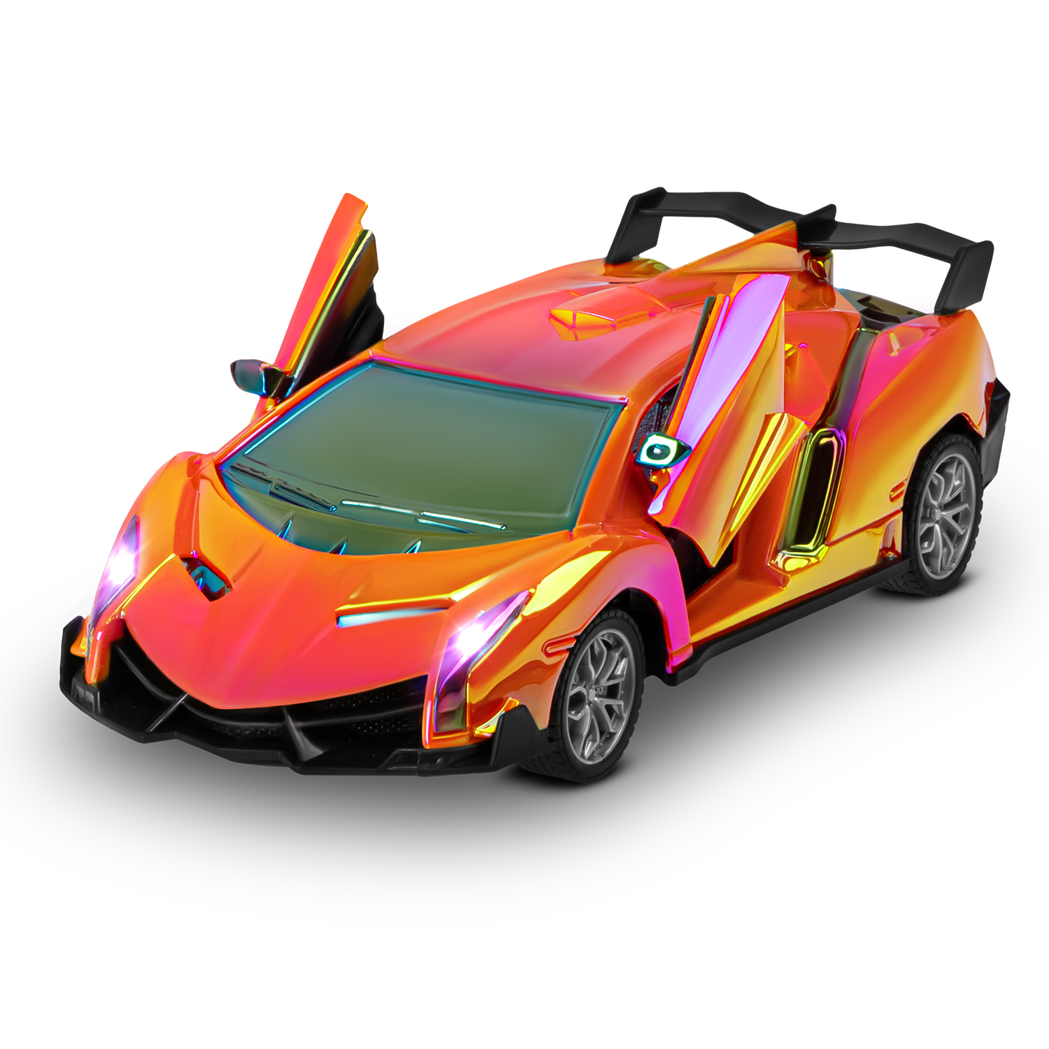 Отличительная особенность данной модели - двери, открывающиеся вверх нажатием кнопки на пульте управления. Резиновые рельефные шины обеспечивают машинке отличное сцепление и высокую скорость на любых поверхностях. Машинка легко управляется интуитивно понятным пультом. Светодиодная подсветка фар сделает процесс игры по-настоящему захватывающим. Машинка на пульте управления имеет ударопрочный корпус, который обеспечивает надежную защиту от механических повреждений.