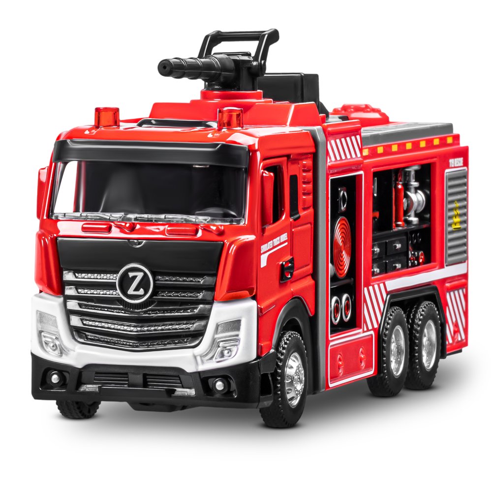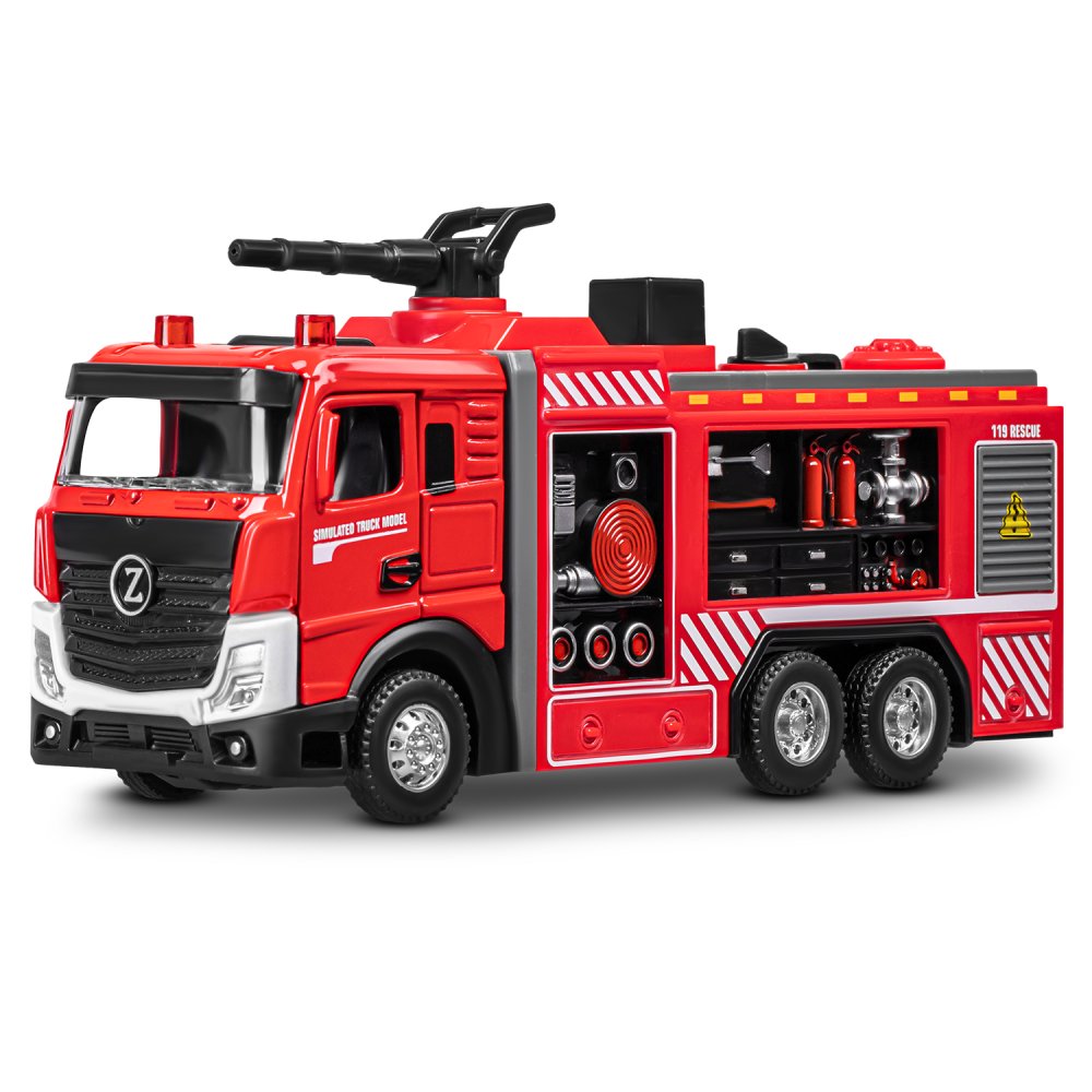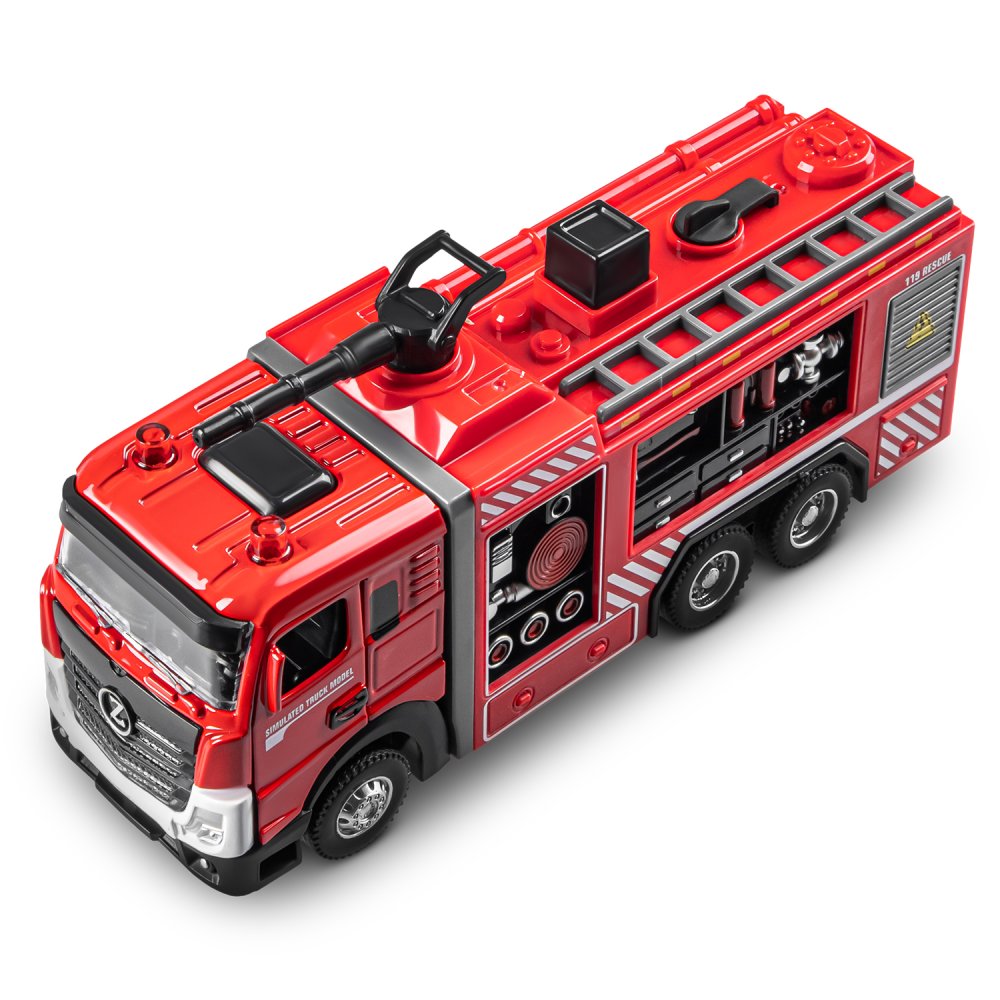 Главной особенностью данной модели пожарной машины является возможность запуска воды! Для этого нужно залить воду в специальный отсек при помощи ёмкости для воды (входит в комплект) и нажать кнопку- помпу на машине. Такая пожарная машина увлечет ребенка надолго! Открывающиеся двери кабины добавят реалистичности в игру, позволяя придумывать разнообразные сценарии спасательных операций. Спецсигналы и яркий свет проблесковых маячков сделают игру еще более захватывающей. Ребенку будет невероятно интересно играть с такой функциональной и реалистичной пожарной машиной! Игрушка оснащена инерционным механизмом. Чтобы она поехала вперед, ее нужно немного откатить назад.