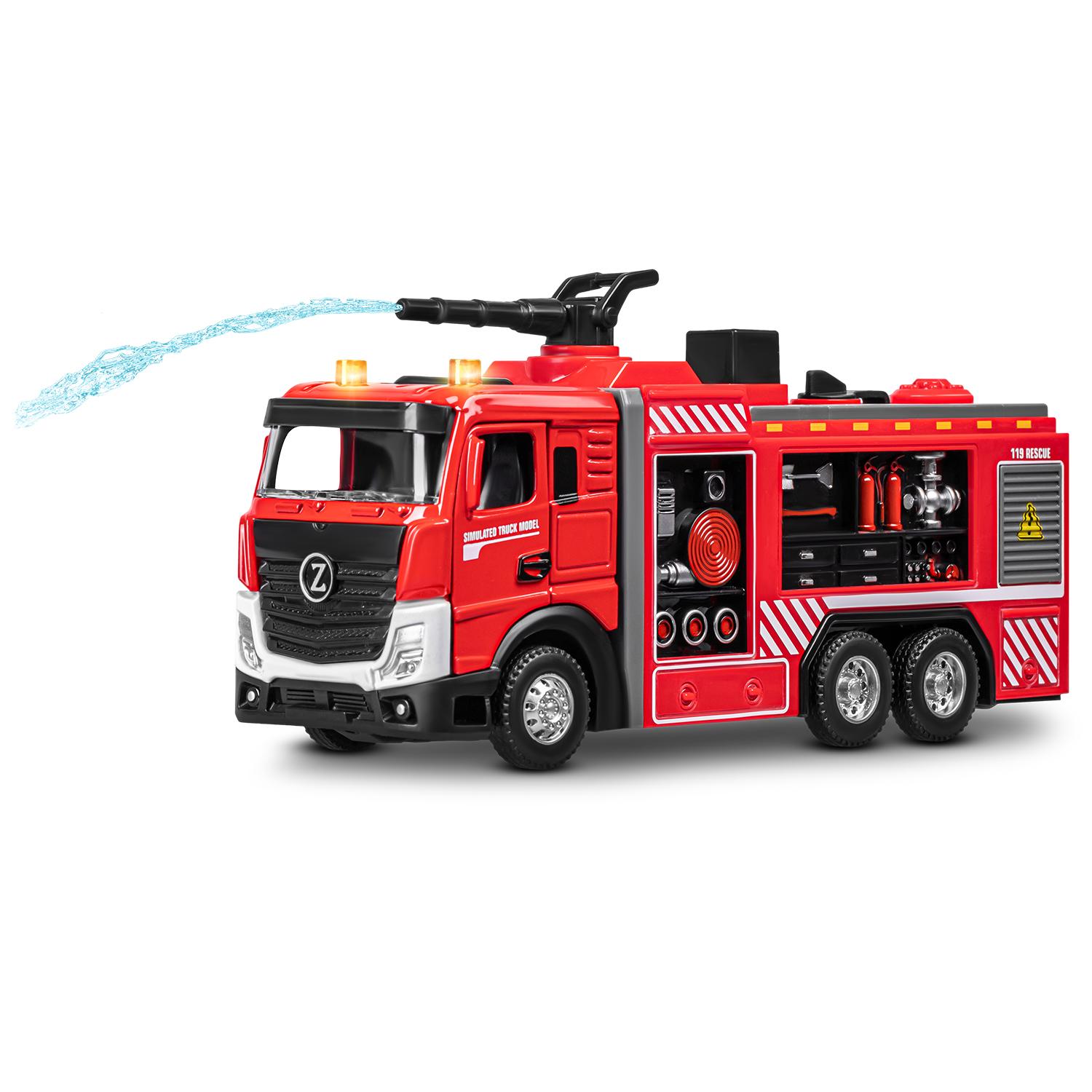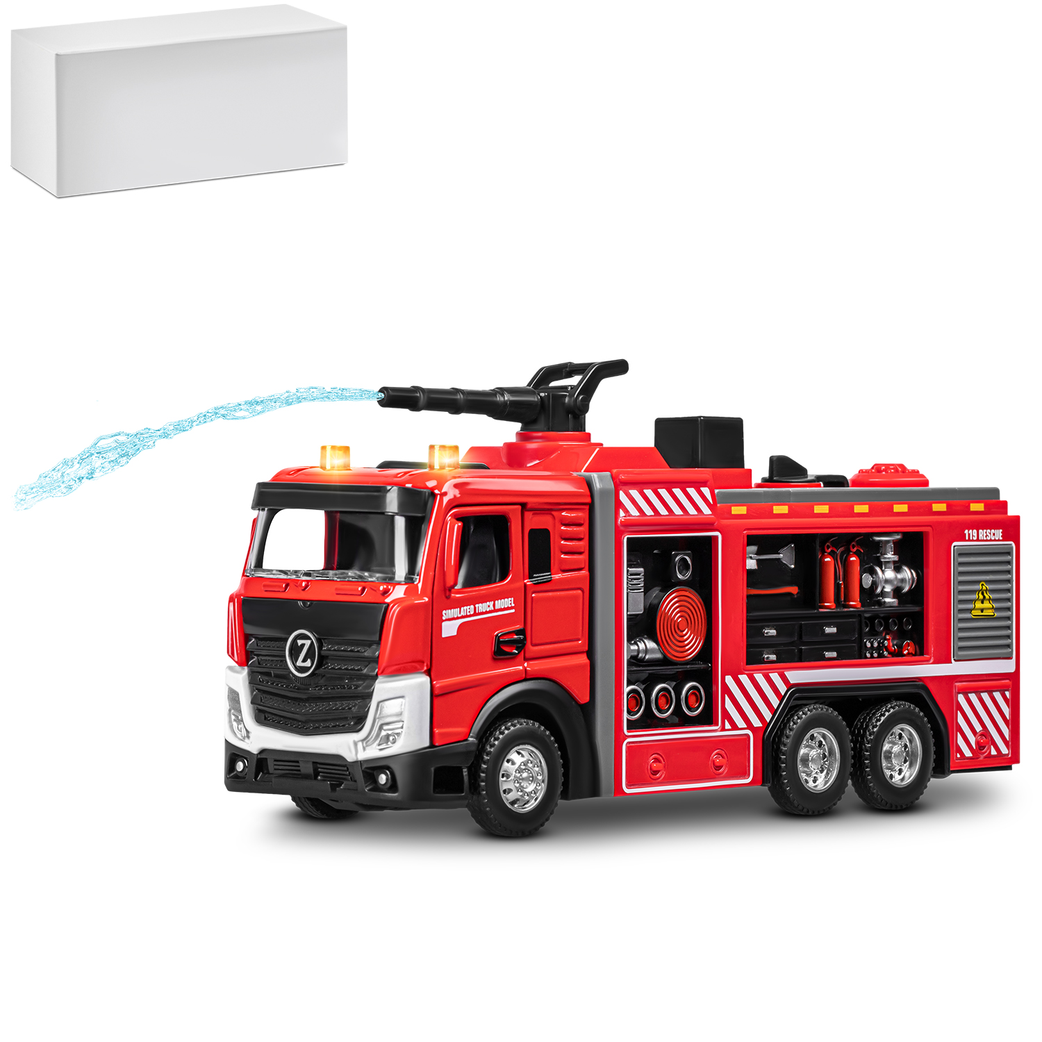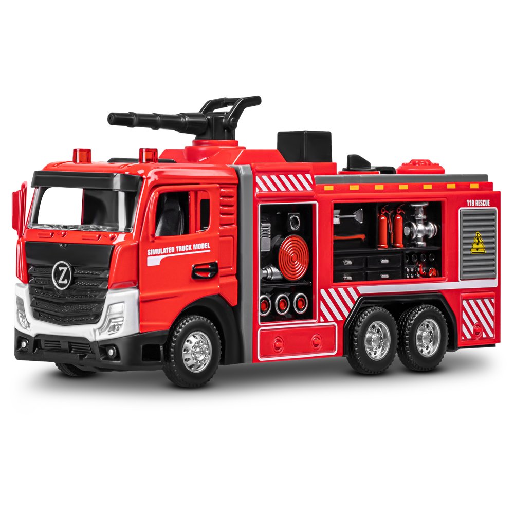 Главной особенностью данной модели пожарной машины является возможность запуска воды! Для этого нужно залить воду в специальный отсек при помощи ёмкости для воды (входит в комплект) и нажать кнопку- помпу на машине. Такая пожарная машина увлечет ребенка надолго! Открывающиеся двери кабины добавят реалистичности в игру, позволяя придумывать разнообразные сценарии спасательных операций. Спецсигналы и яркий свет проблесковых маячков сделают игру еще более захватывающей. Ребенку будет невероятно интересно играть с такой функциональной и реалистичной пожарной машиной! Игрушка оснащена инерционным механизмом. Чтобы она поехала вперед, ее нужно немного откатить назад.