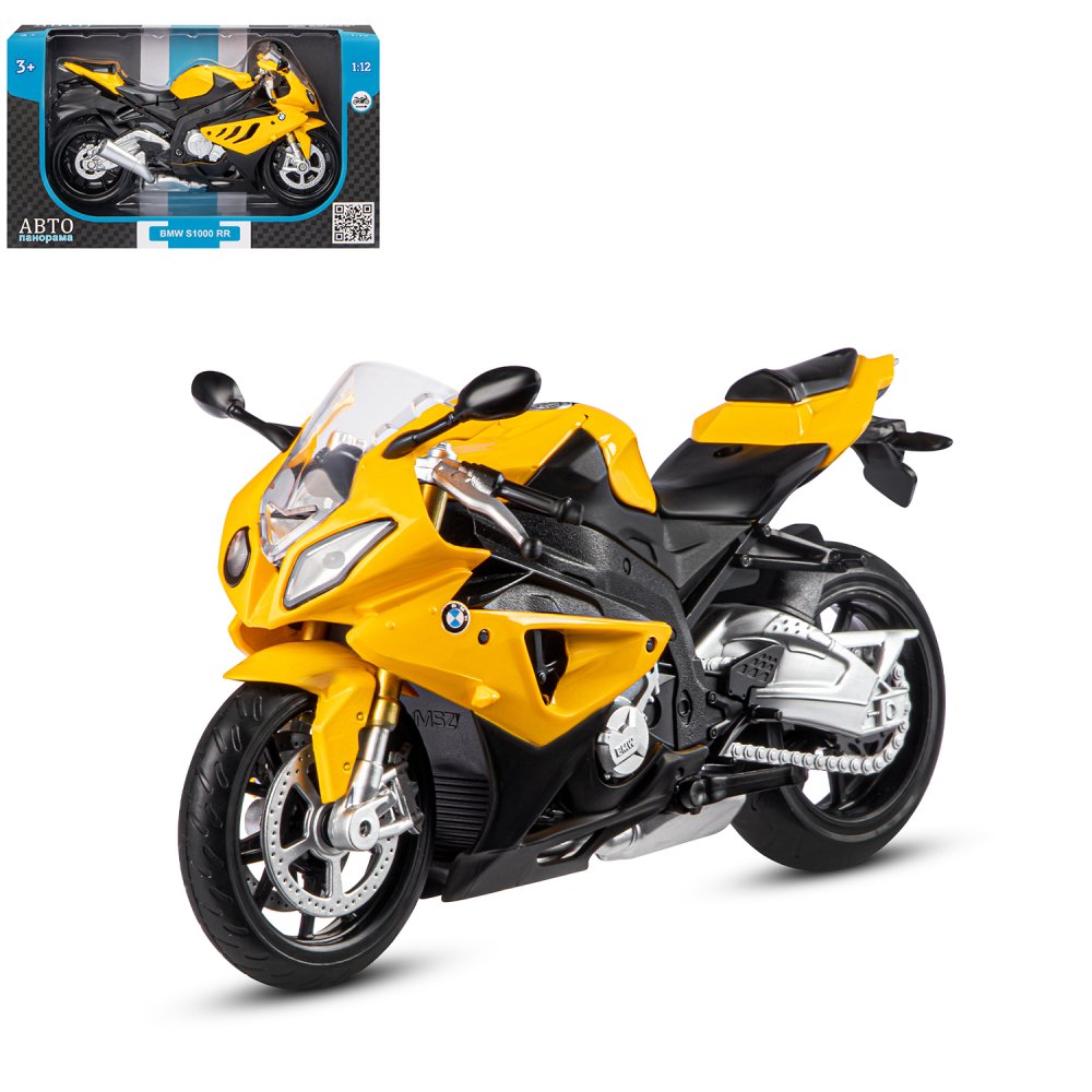 ТМ "Автопанорама" Мотоцикл металл. 1:12 BMW S1000RR, желтый, свободный ход колес,в/к 7,1*11,7*20,6 с
