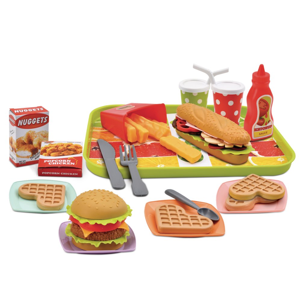 Яркий поднос, тарелки и столовые приборы позволят малышу почувствовать себя настоящим шеф-поваром и улучшить навыки кулинарии.