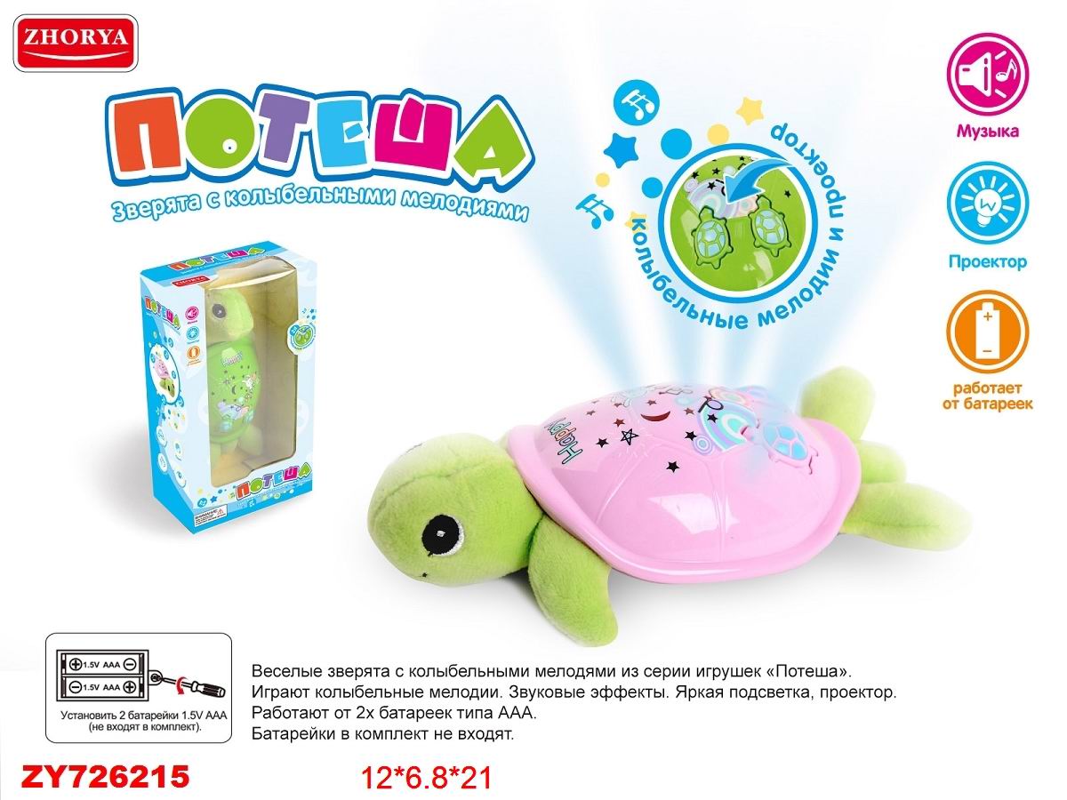 Веселые зверята с колыбельными мелодиями из серии "Потеша".Играют колыбельные мелодии.Звуковые эффекты,Яркая подсветка,проектор. Работает от 2х батареек типа AAA(в комплект не входят) в/к 12*6,8*21 см