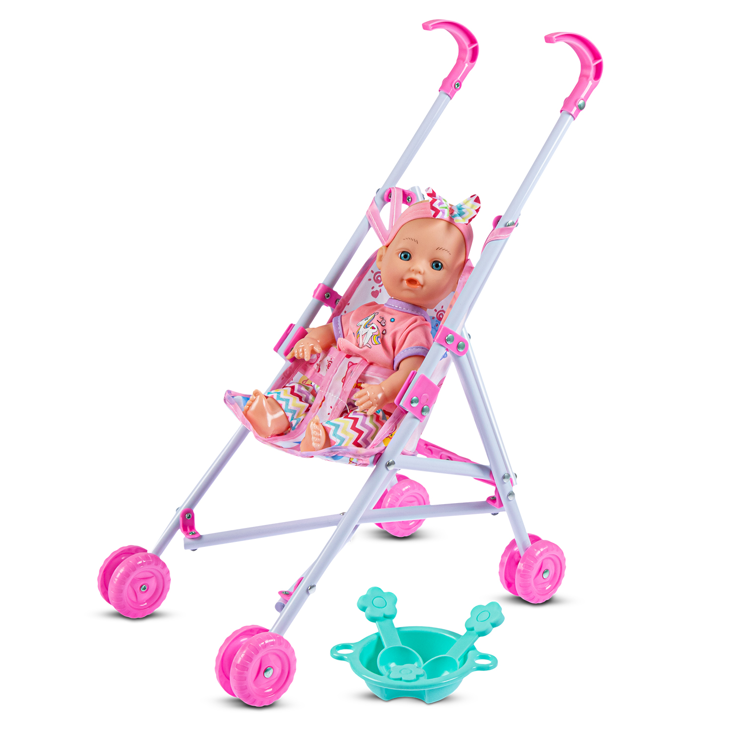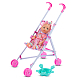 Игровой набор для девочек состоит из нескольких предметов: пупс, коляска-трость, тарелка, ложка, вилка.