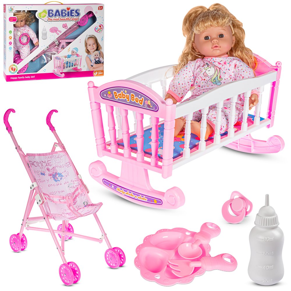 В комплекте: кукла, кроватка-колыбель, коляска-трость, бутылочка, соска, тарелка, ложка, вилка