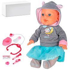 Интерактивный пупс торговой марки "Amore Bello" станет отличным подарком для ребенка, ведь он так сильно похож на настоящего малыша, а еще обладает множеством игровых возможностей. У пупса реалистичный внешний вид, он имеет правильные пропорции тела, умеет сидеть, ножки и ручки двигаются. Милые черты лица, большие глаза, которые закрываются в горизонтальном положении, длинные ресницы, красивая одежда обязательно понравятся маленькой принцессе. Озвученный пупс реагирует на прикосновения, может плакать и смеяться, капризничать и сопеть. Также он умеет пить водичку из бутылочки и ходить на горшок. Говорящий пупс произносит фразы на русском языке, среди них "мама", "папа", "я хочу спать", издает различные звуки младенца, а также рассказывает стишок. В комплект с куклой входит набор аксессуаров, включающий инструменты доктора, ведь любимый пупс может заболеть. При этом у него горят красным светом щечки, он чихает, кашляет и плачет, совсем как настоящий ребенок. Но стоит сделать укол с помощью игрушечного шприца, послушать сердцебиение с помощью стетоскопа, как малыш снова смеется, покраснение лица проходит, а маленький доктор радуется выздоровлению своего пациента. Игра с такой функциональной куклой научит малышку ответственности, заботе о младших, позволит лучше понимать свои эмоции, а также почувствовать себя в роли заботливой мамы или врача. Игрушка сделана из качественных материалов, развивает фантазию и мелкую моторику Она полностью безопасна для детей, имеет необходимый сертификат и соответствует установленным требованиям. Характеристики: Возраст от 3 лет Функции: свет, звук, реагирует на прикосновения Аксессуары: горшок, стетоскоп, шприц, соска, бутылочка, градусник, браслет на ручку Батарейки: пупс - 3 батарейки типа AA (не входят в комплект), стетоскоп - 3 батарейки типа LR44 (входят в комплект) Размер пупса: 35 х 20 х 11 см. Упаковка: белая коробка Материал: ПВХ, пластик