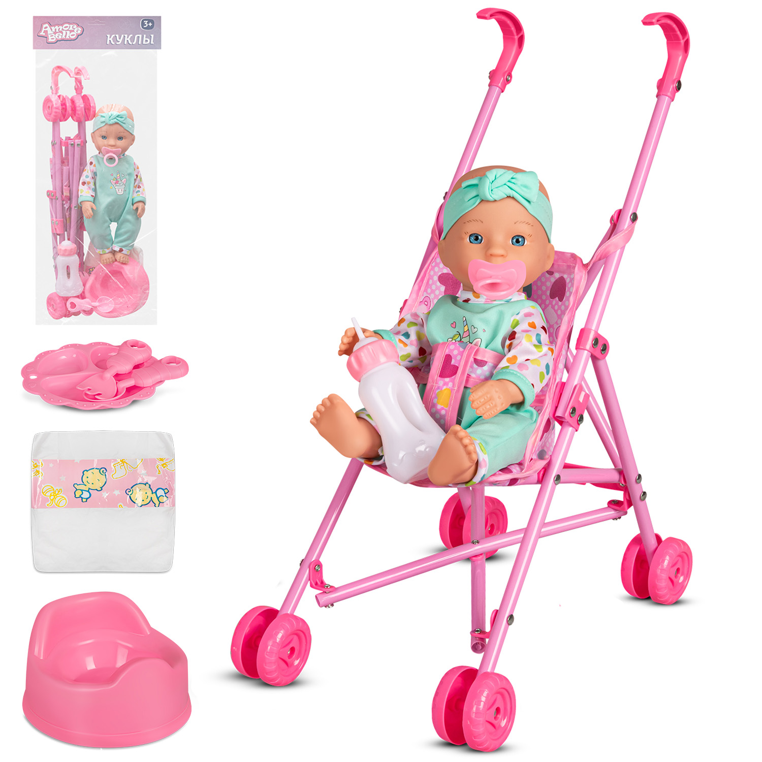 ТМ "Amore Bello" Пупс с коляской, Шаинский, русский язык, розовый, в/п