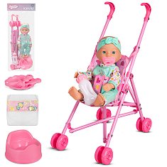 В комплекте с куклой идет все необходимое для ухода за малышом: коляска трость, удобная бутылочка для кормления, горшочек, успокаивающая пустышка, подгузник, а так же тарелочка с ложкой и вилкой. Ваша дочка сможет полностью погрузиться в мир заботы о своем "ребенке", развивая ответственность и чуткость.