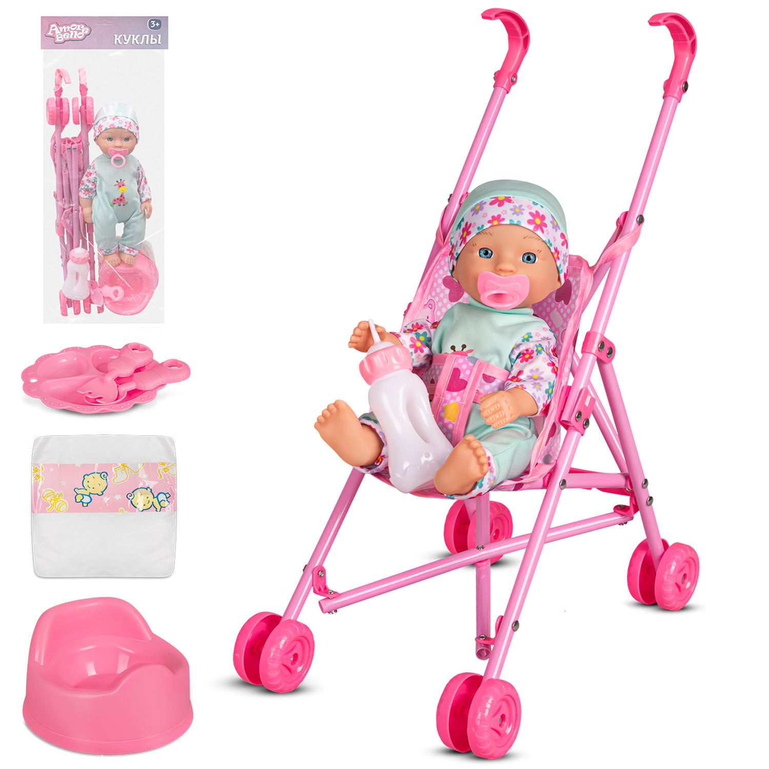 ТМ "Amore Bello" Пупс с коляской, Шаинский, русский язык, розо. платье, в/п