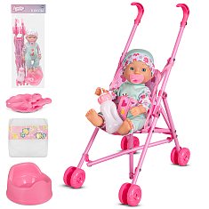 В комплекте с куклой идет все необходимое для ухода за малышом: коляска трость, удобная бутылочка для кормления, горшочек, успокаивающая пустышка, подгузник, а так же тарелочка с ложкой и вилкой. Ваша дочка сможет полностью погрузиться в мир заботы о своем "ребенке", развивая ответственность и чуткость.