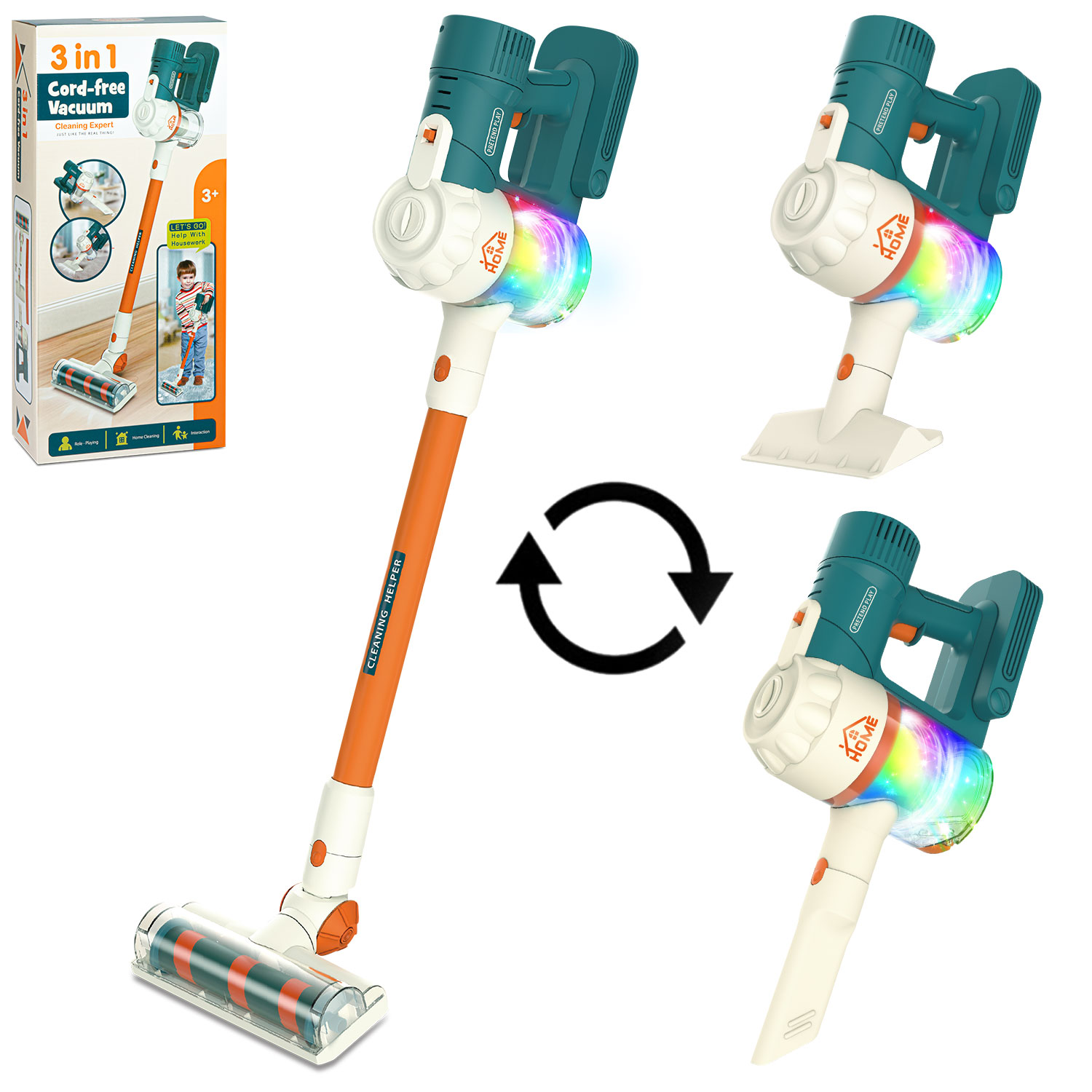 Игрушечный пылесос 3 в 1 можно использовать в виде полноценного устройства, длина которого 77 сантиметров, и в виде небольшого мобильного пылесоса, который используется, например, для чистки мягкой мебели. В комплект входят 5 деталей, которые позволят собрать 6 комбинаций пылесоса, используя различные насадки.