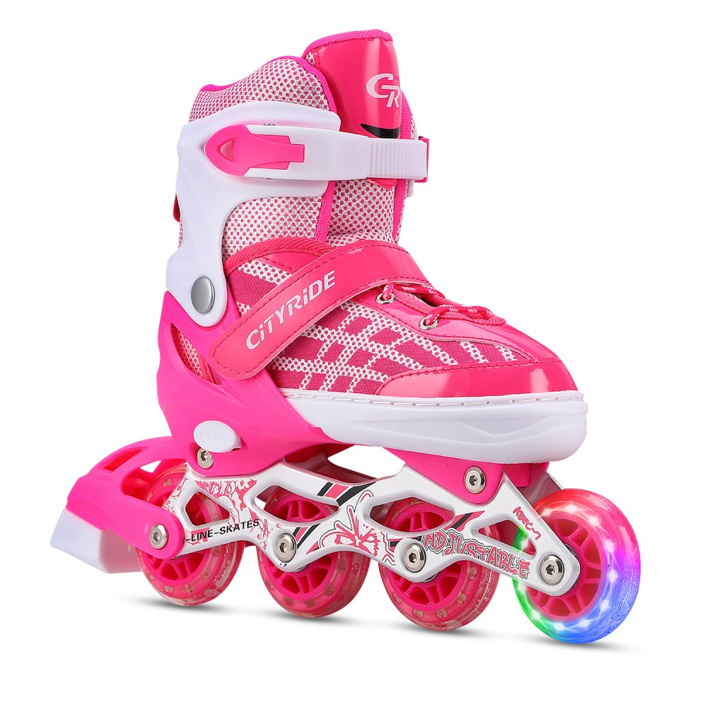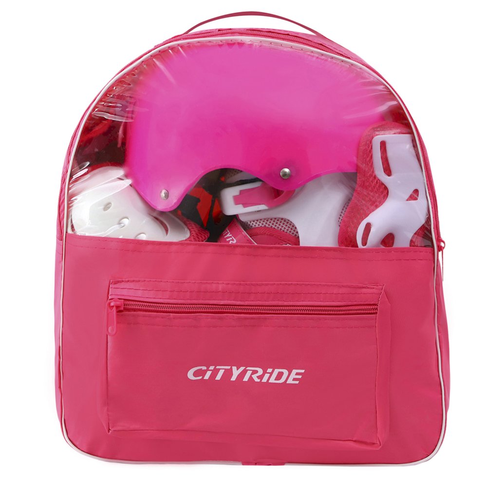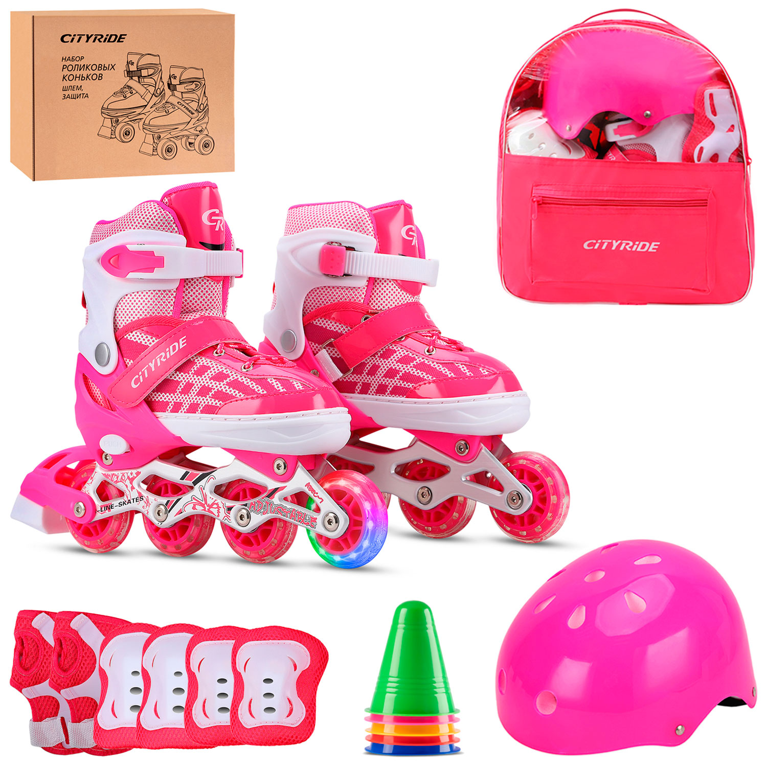 "CITY-RIDE" Комплект (ролики, защита, шлем, конусы 5 шт), переднее колесо со светом, S размер (29-33), ABEC 7, цвет розов в н/сумке