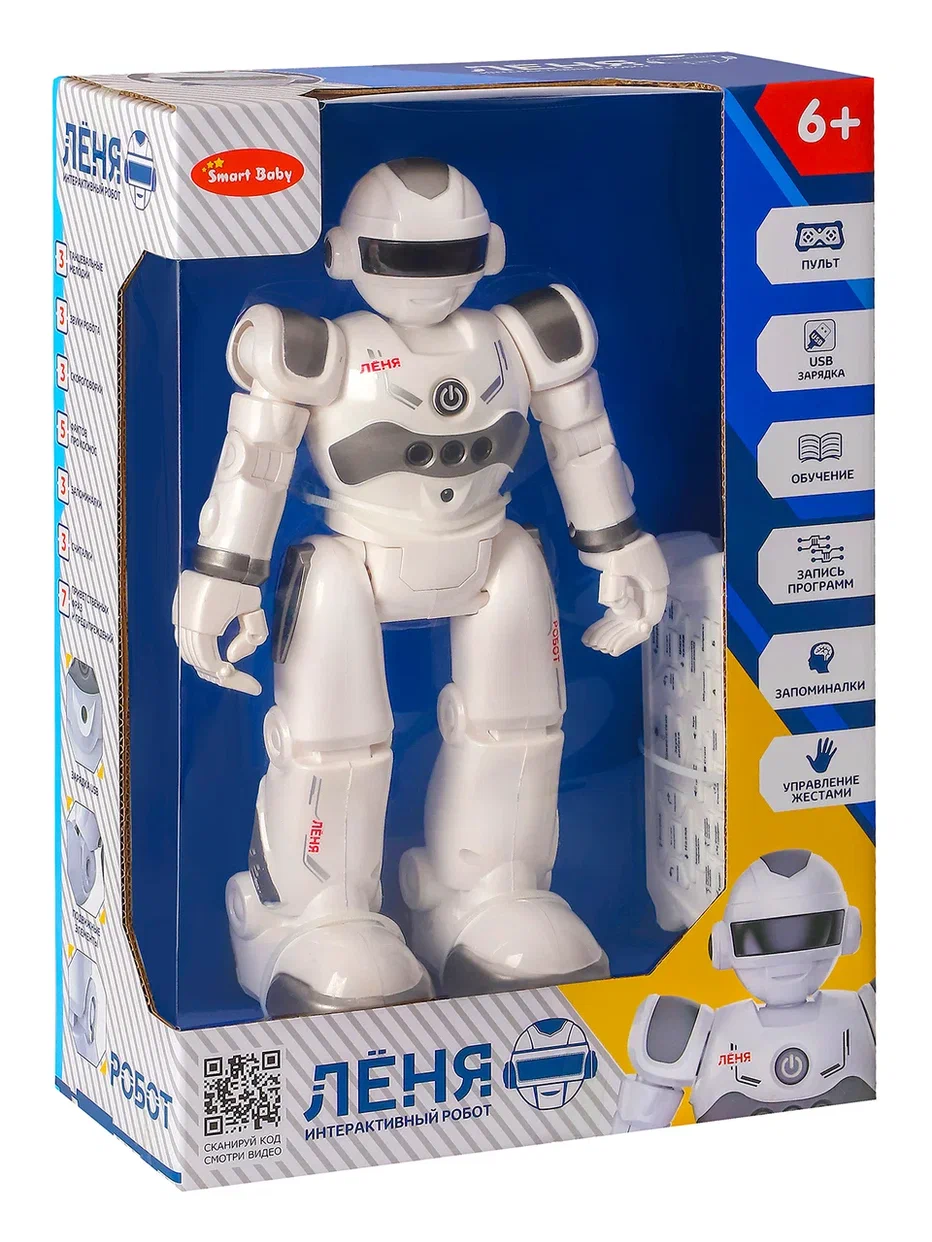 Робот Лёня - интерактивный робот, который умеет ходить, танцевать, реагирует на жесты, рассказывает скороговорки, считалочки, запоминалки, интересные факты про космос, задает вопросы и выполняет множество других функций.