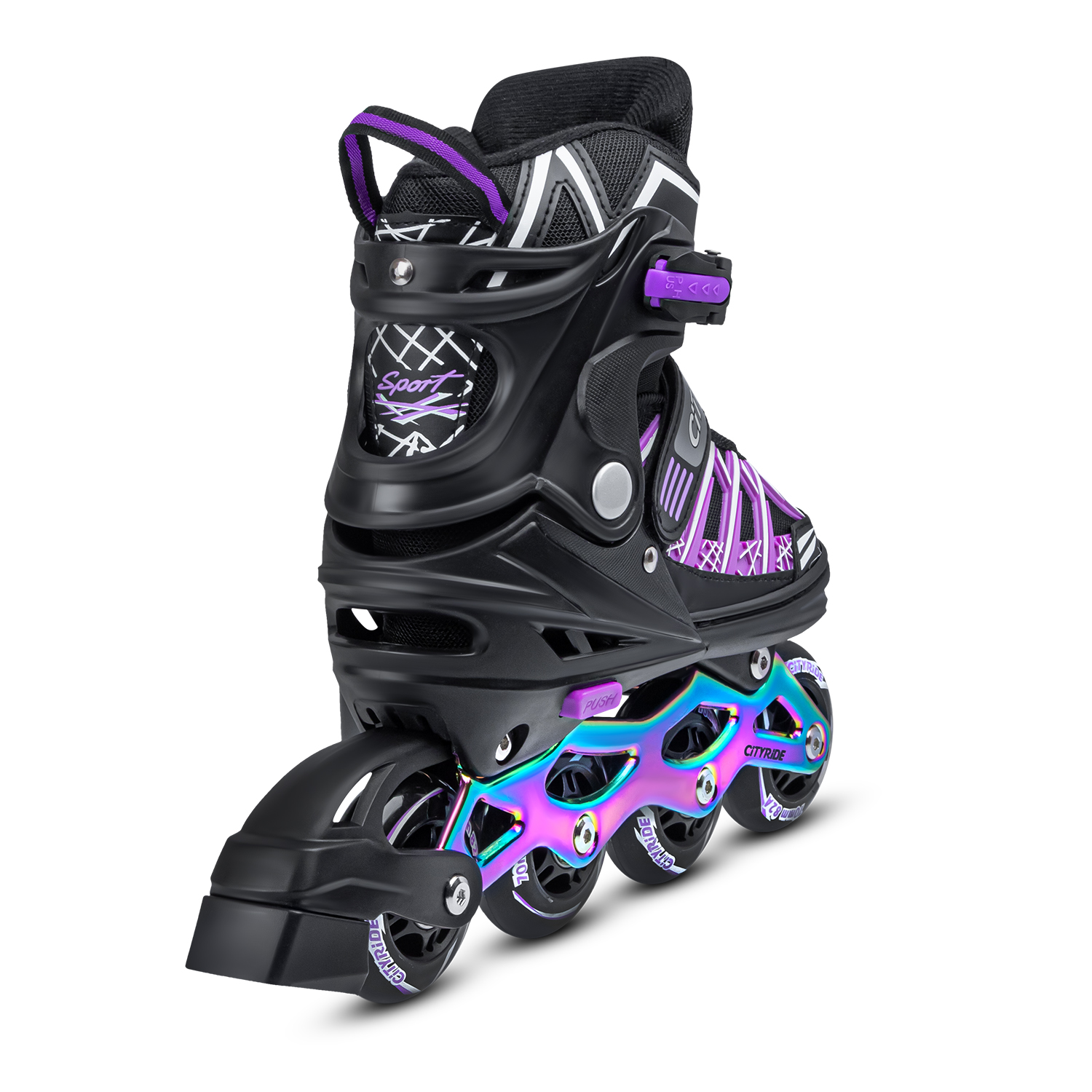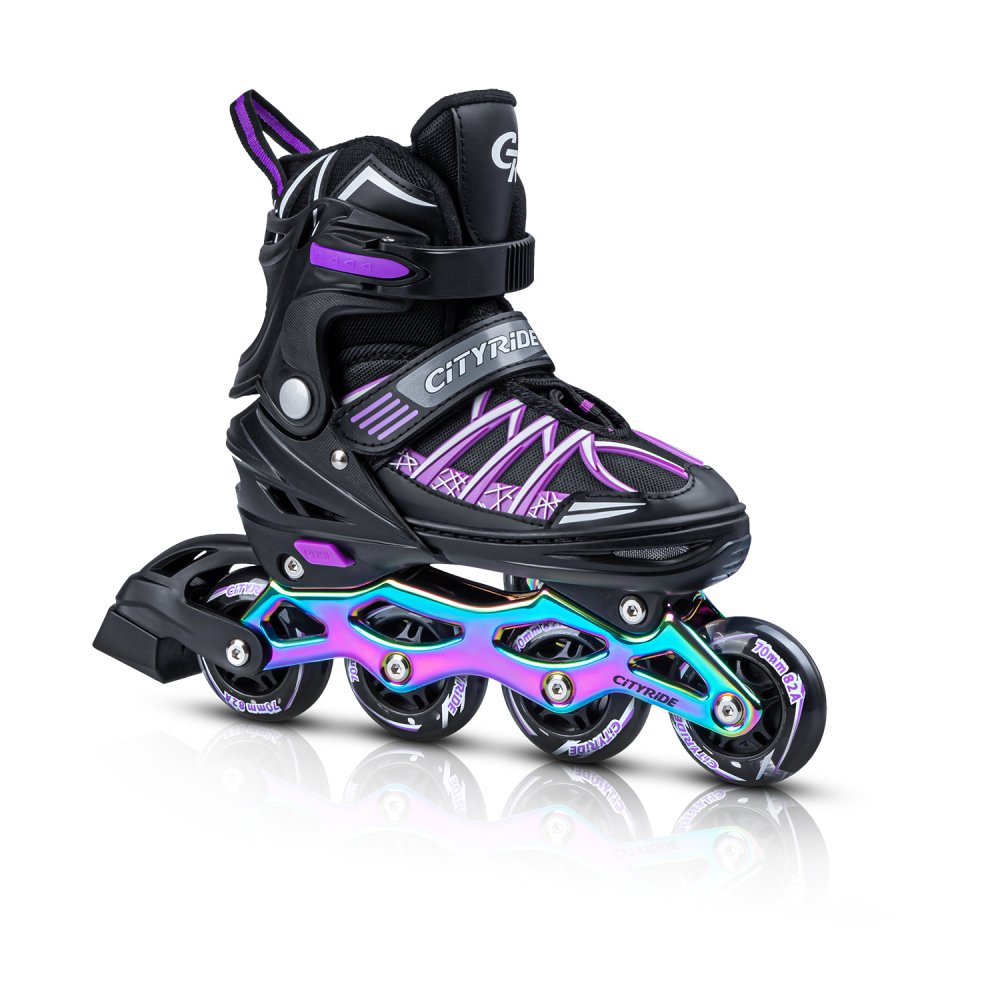 Роликовые коньки CITYRIDE, Черный-фиолетовый, PU колеса, переднее колесо со светом, подшипники ABEC 7, анодированная алюминиевая рама, текстильный мысок с резиновыми вставками, в/к 5сл гофрокартон