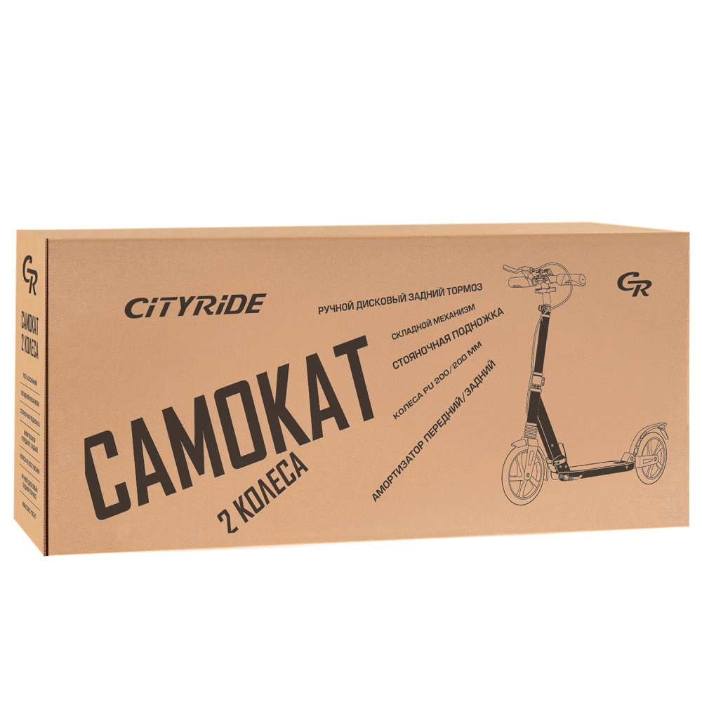 2хкол. самокат CITYRIDE 200MM disk, ал. 100%. Аморт. передний/задний. Колеса PU 200/200 мм. Подшипники: Abec-9. Грипсы: резина. Хомуты анод., замок на руле. Ручной дисковый задний тормоз. Черный