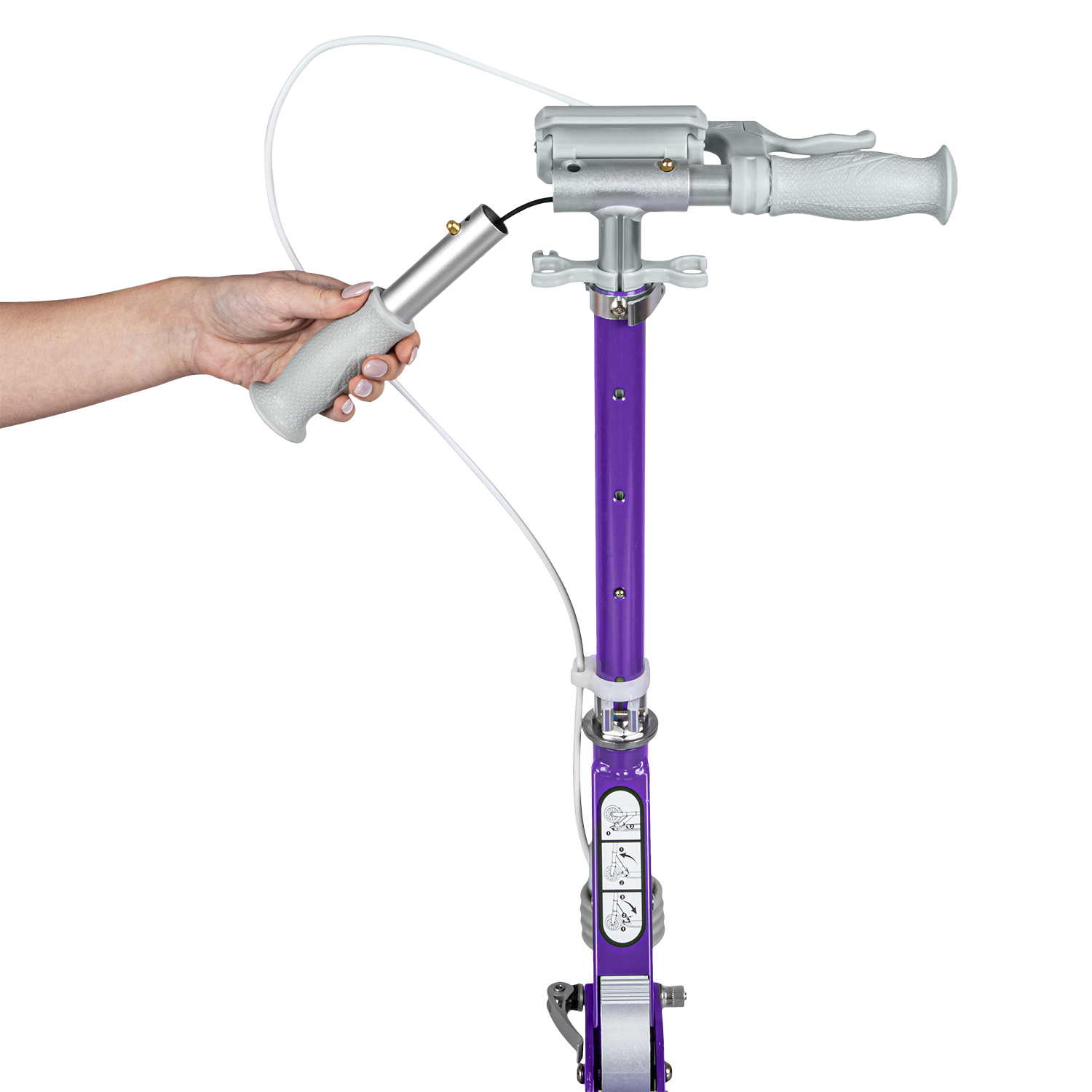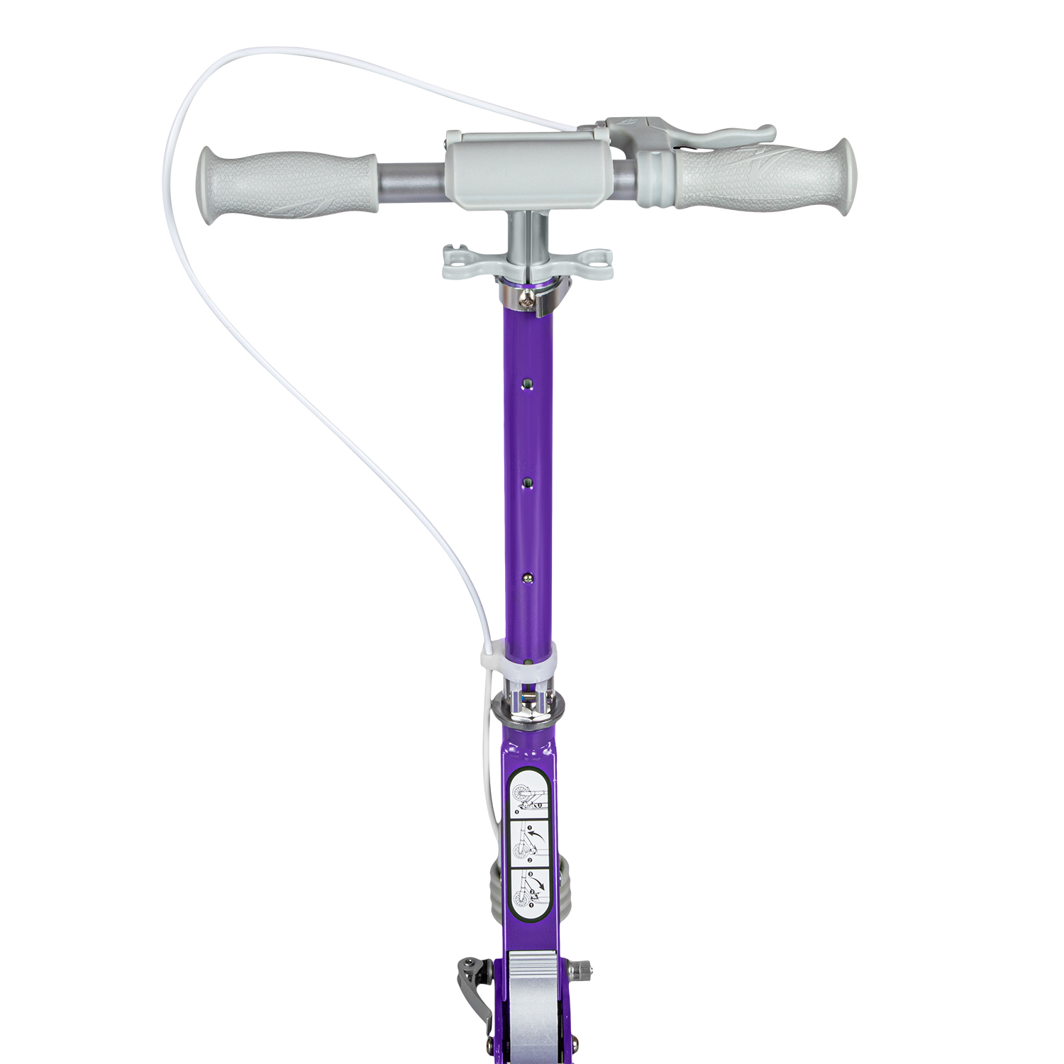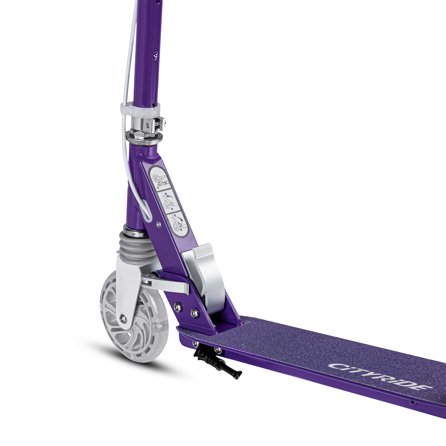 Двухколесный самокат CITY-RIDE 120, ал. 100%. Аморт. передний. Колеса PU 120/120 мм. Подшипники: Abec-9. Грипсы: резина. Хомуты анод, замок на руле. Ручной задний тормоз, фиолетовый
