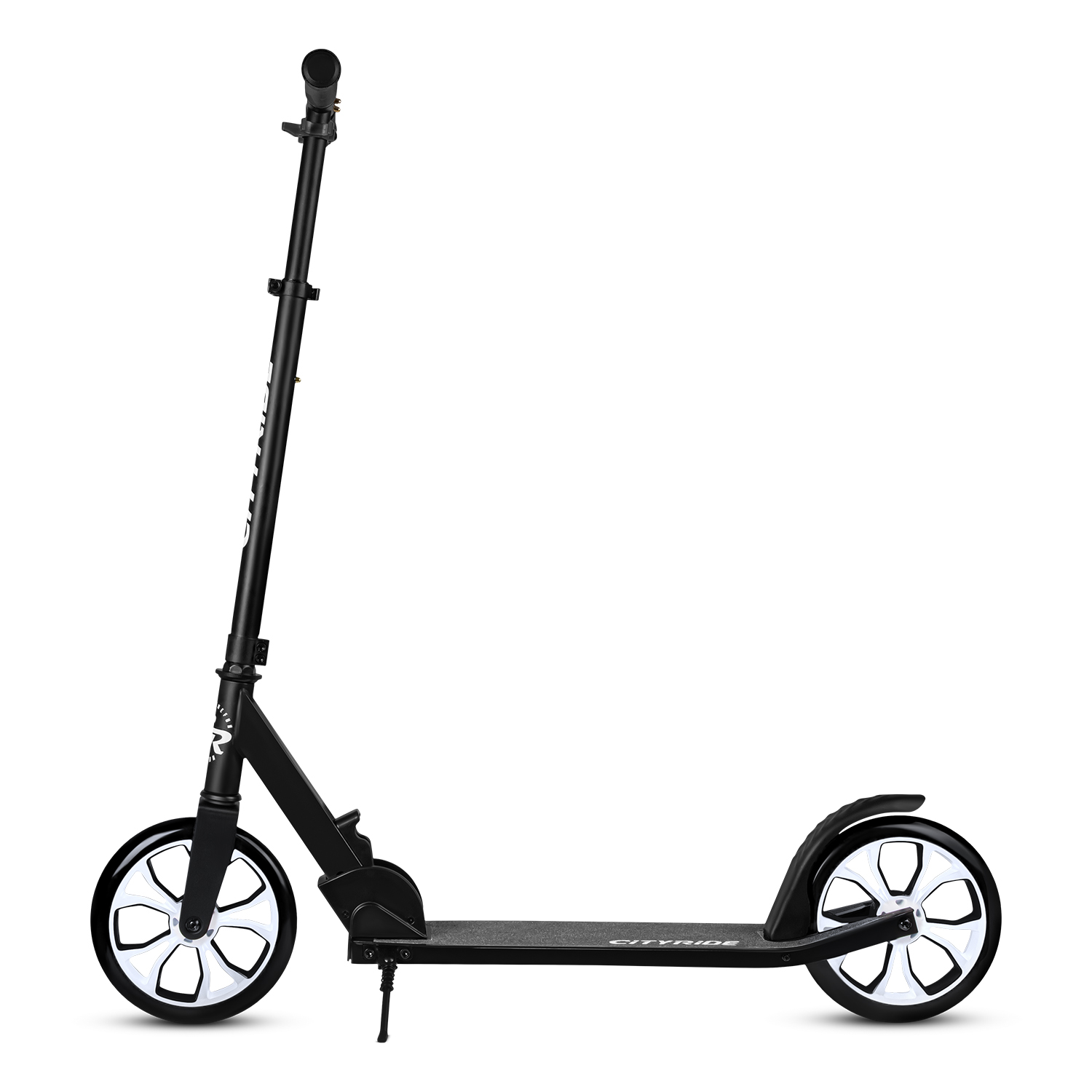 Двухколесный самокат CITYRIDE 200, ал. 50/50%, t-bar сталь, грипсы 135мм TPR, колеса PU 200/200, 86A, подножка, abec 9, черный