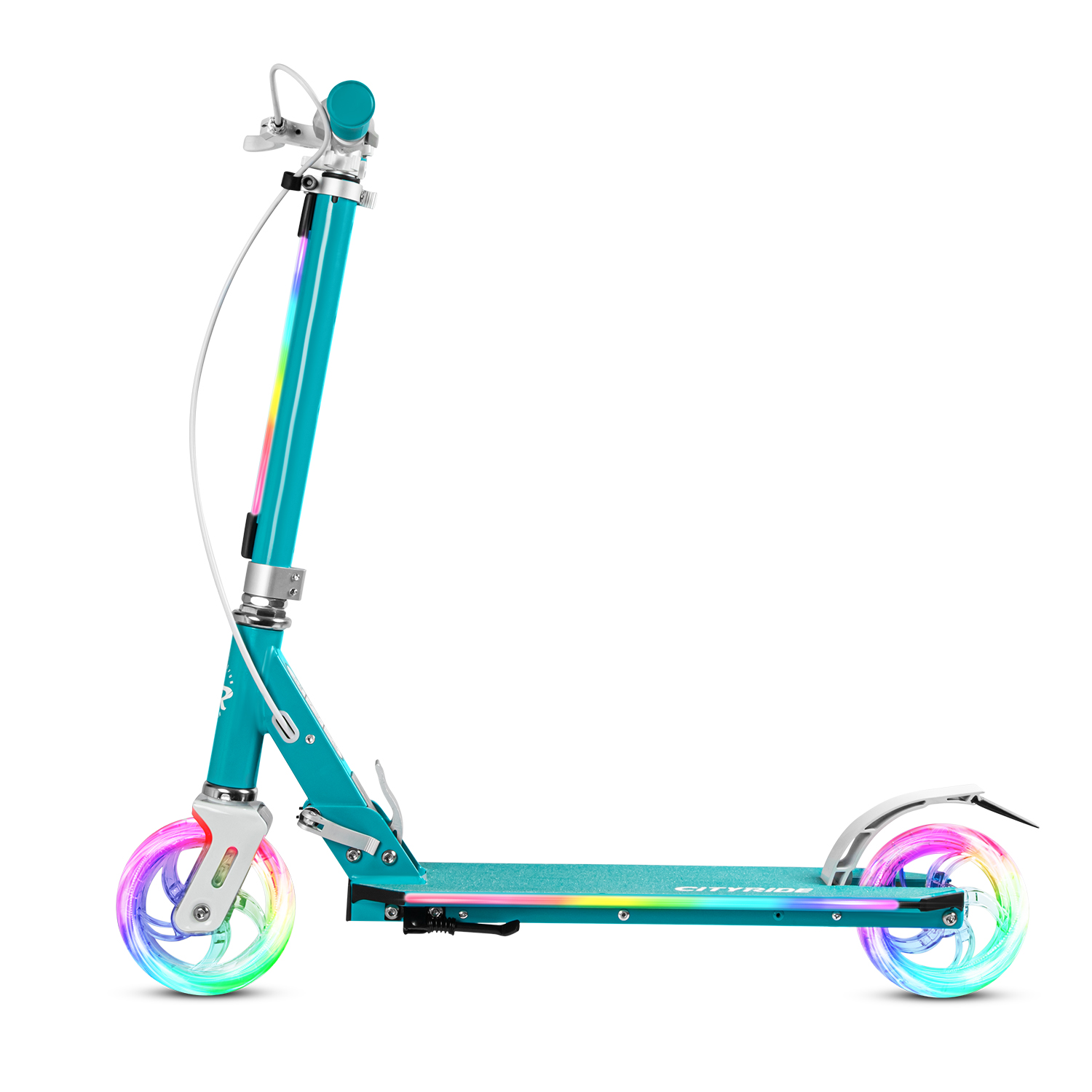 Самокат 2хколесный Материал:алюминиевый сплав.Ручка:TPR , ручной тормоз Колеса:145X30mm PU Подшипники:ABEC-7 Размер деки :50x12cm Цвет: зеленый