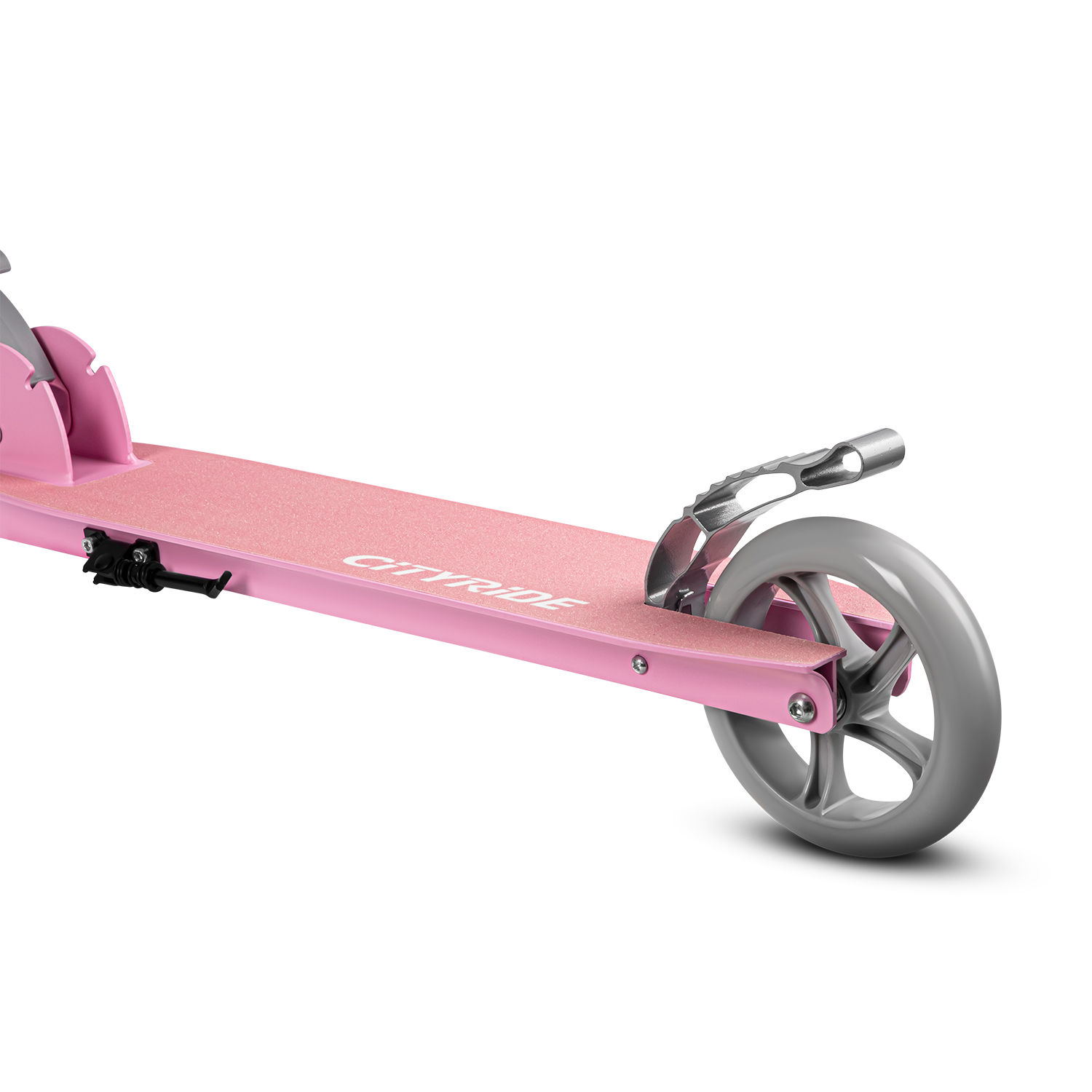 Самокат городской оснащен алюминиевым тормозом, расположенным на заднем колесе. Тормоз срабатывает быстро и эффективно, обеспечивая безопасность при остановке.