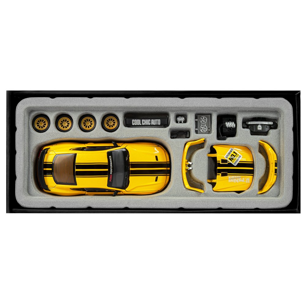 Лицензионная сборная металлическая модель Ford Mustang GT- реалистичная копия компактного спортивного автомобиля в масштабе 1:42. Она отлично дополнит игрушечный гараж и станет прекрасным подарком для автолюбителя. Модель машинки детально проработана и выполнена в легко узнаваемом дизайне как у оригинала. Благодаря своей реалистичности, масштабная модель подойдет для коллекционирования. Особенностью модели является возможность тюнинга. В набор входит 15 предметов для внешнего обвеса, среди которых бампер, комплект колес, крышка капота, спойлер и другие. Кроме этого, можно собрать двигатель, что обязательно заинтересует маленьких механиков. У машинки открываются двери и капот. Колеса с резиновыми покрышками и дисками, детально проработанный салон, фары, прозрачные окна- всё как у настоящего автомобиля. Ребенок будет с удовольствием играть с такой машинкой дома и на улице, а благодаря компактным размерам, сможет брать ее в гости или в путешествие. Игрушка развивает мелкую моторику, реакцию и координацию движения, расширяет кругозор и знакомит с техникой. Металлические модельки - отличный подарок для мальчика на новый год, на 23 февраля или на день рождения!