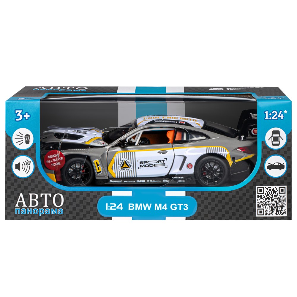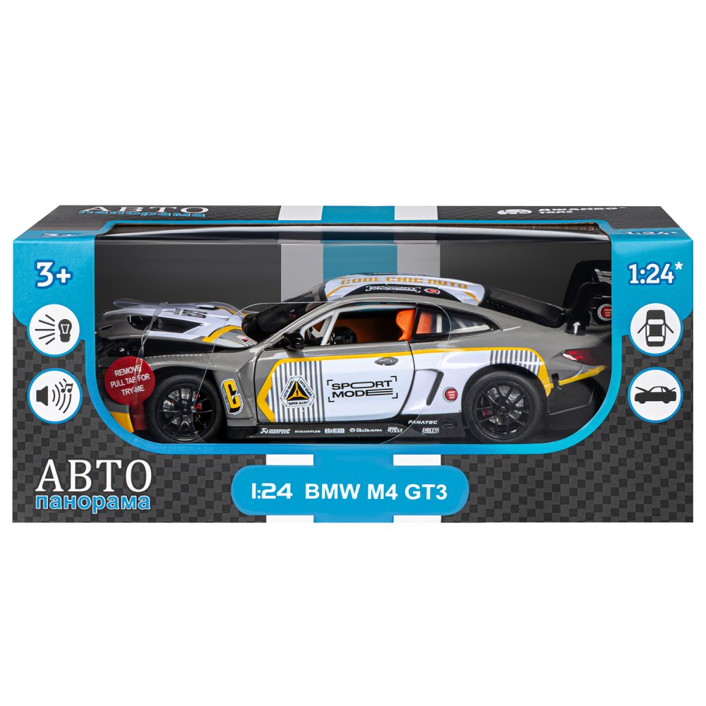 ТМ "Автопанорама" Машинка металлическая, 1:24 BMW M4 GT3, серый, откр. двери и капот, свет, звук, св
