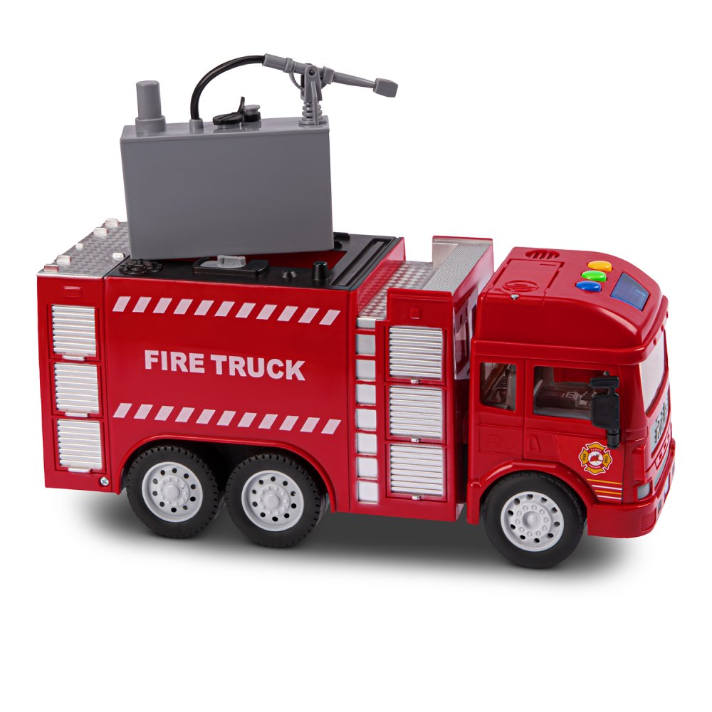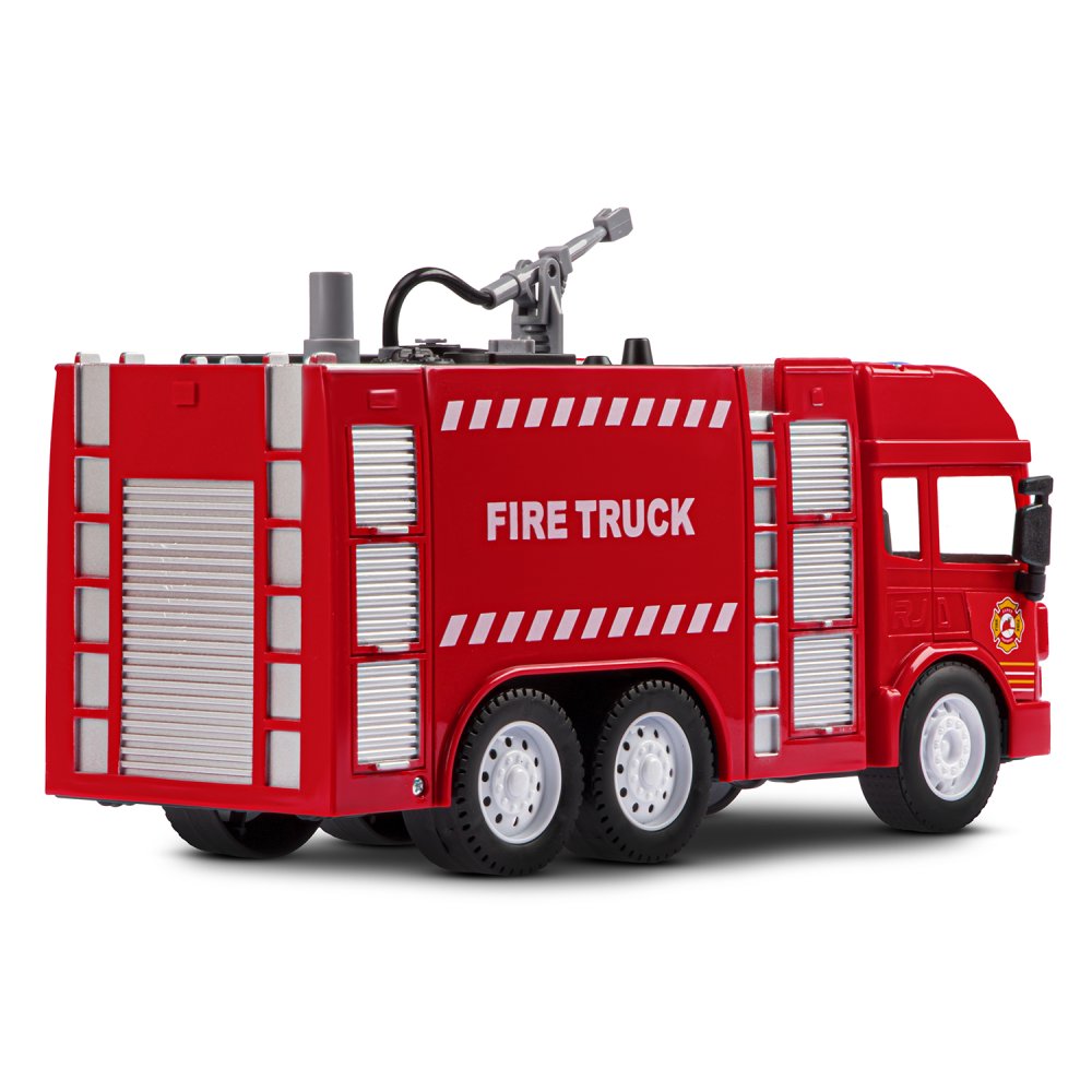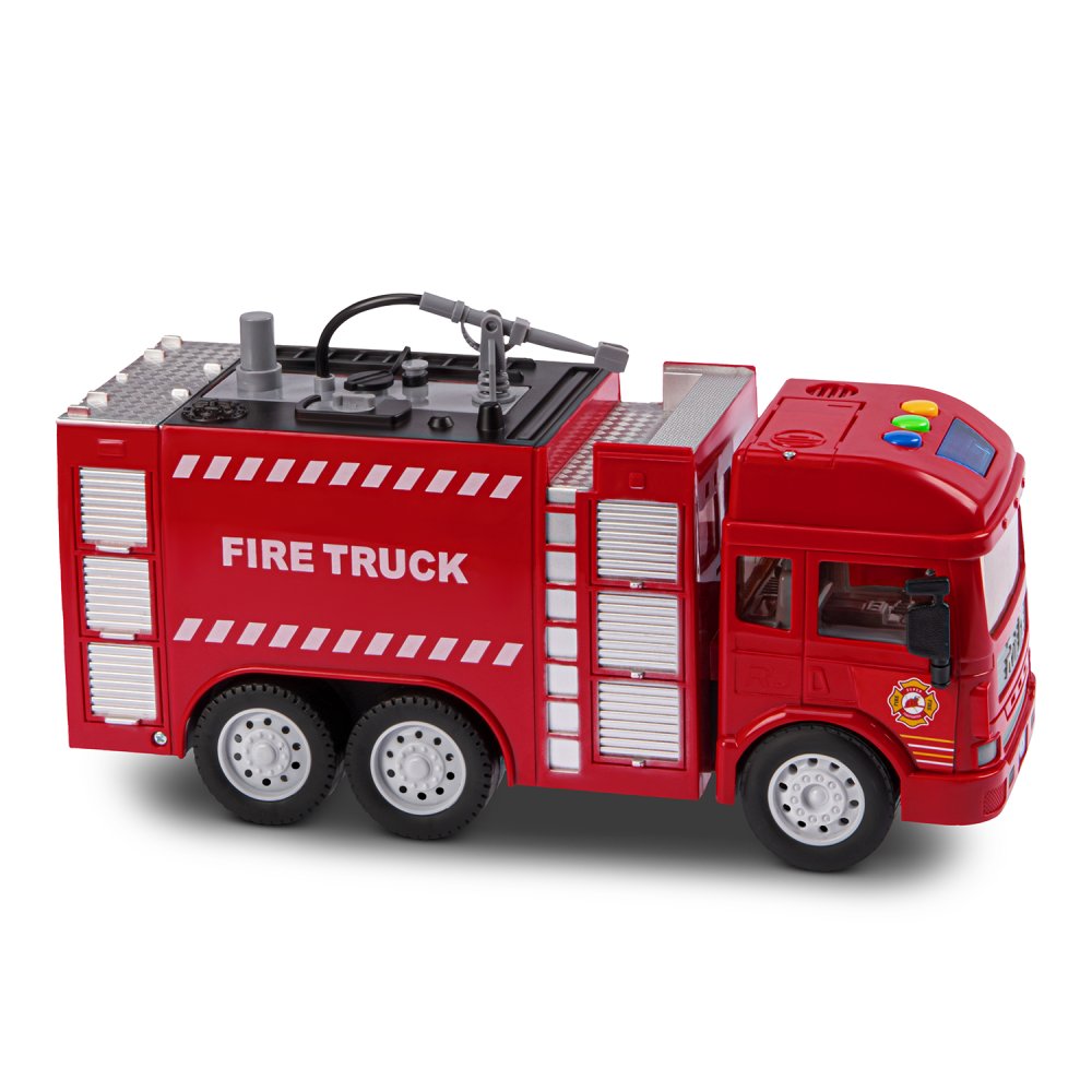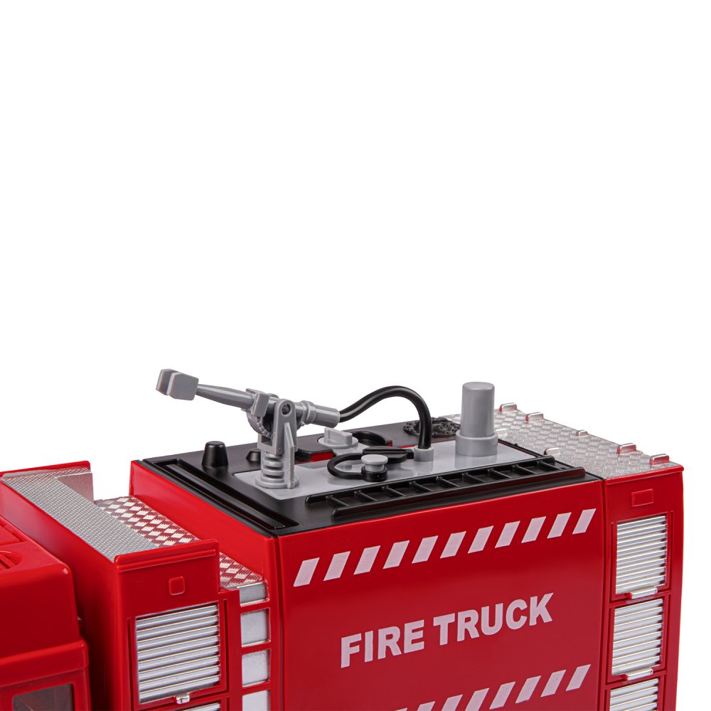 Фрикционная пожарная машина на батарейках выглядит очень реалистично, а световые и звуковые эффекты сделают игровой процесс еще более увлекательным. Также машина стреляет водой, если её предварительно залить в специальную емкость машинки.