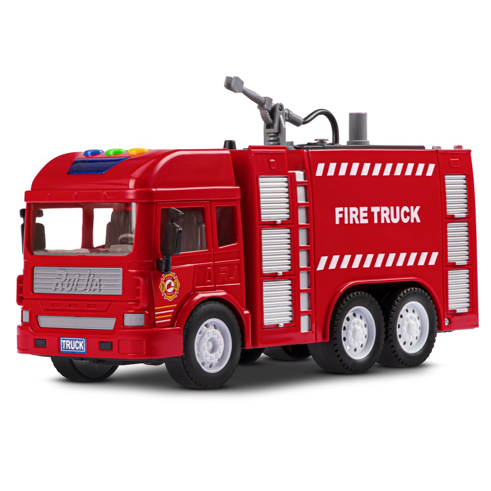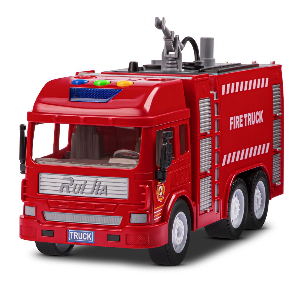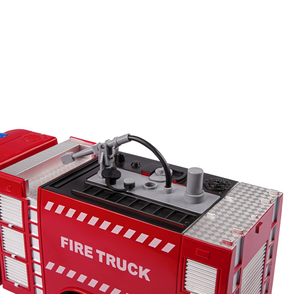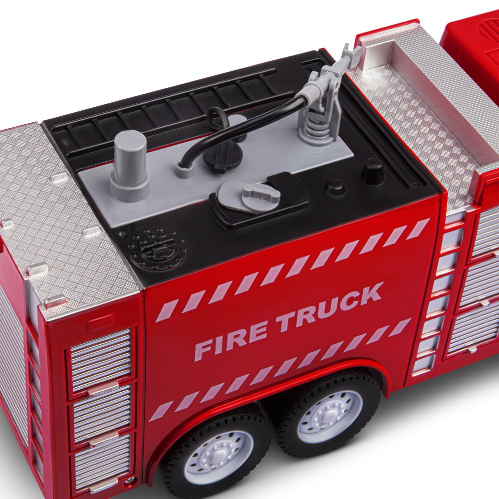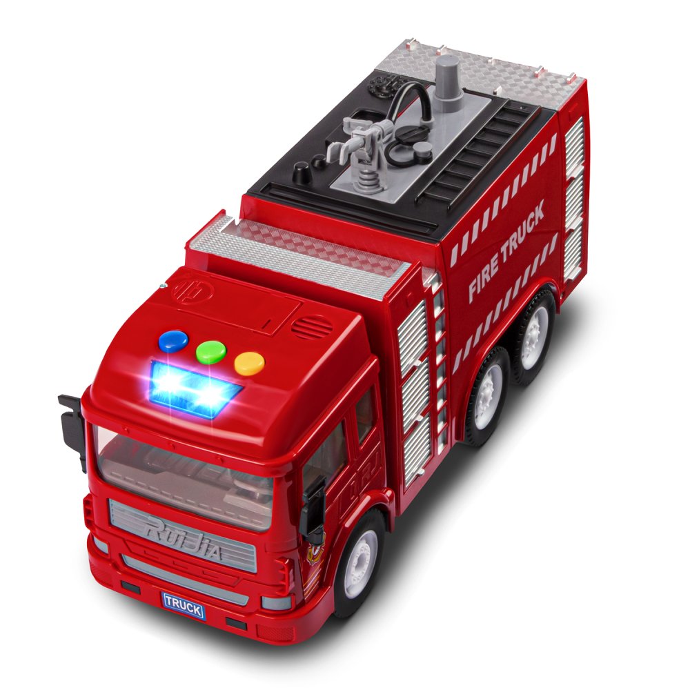 Фрикционная пожарная машина на батарейках выглядит очень реалистично, а световые и звуковые эффекты сделают игровой процесс еще более увлекательным. Также машина стреляет водой, если её предварительно залить в специальную емкость машинки.