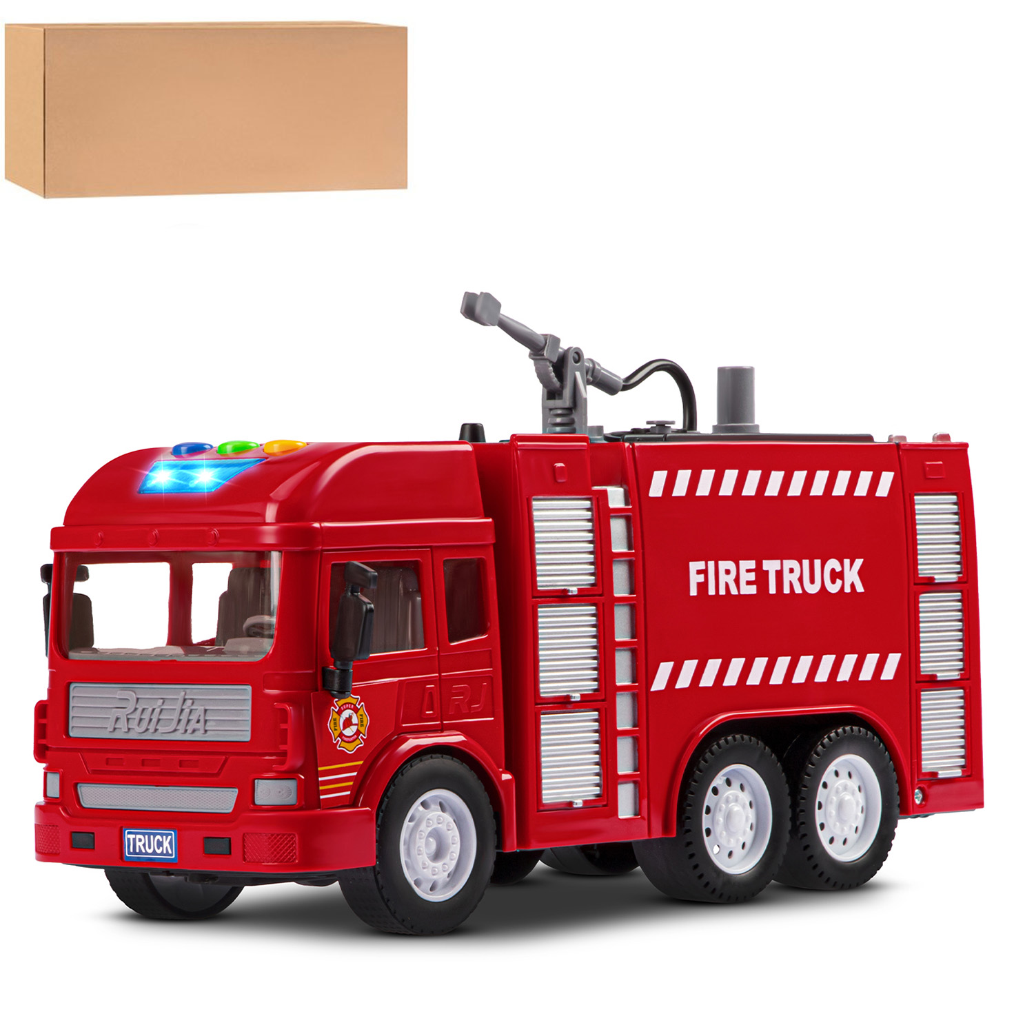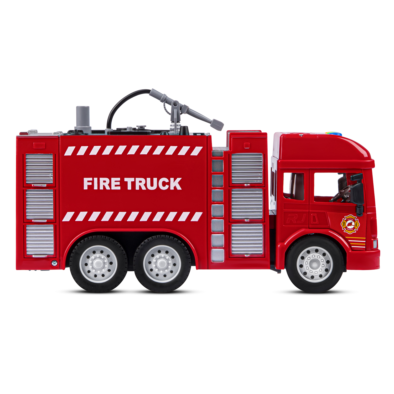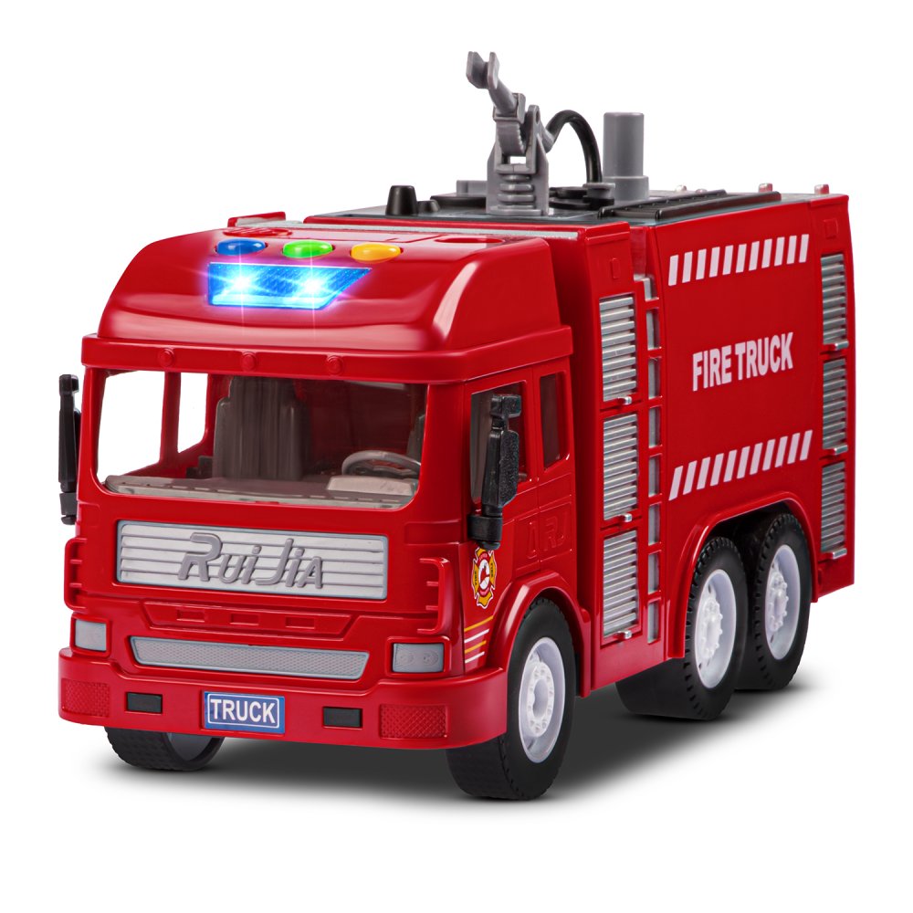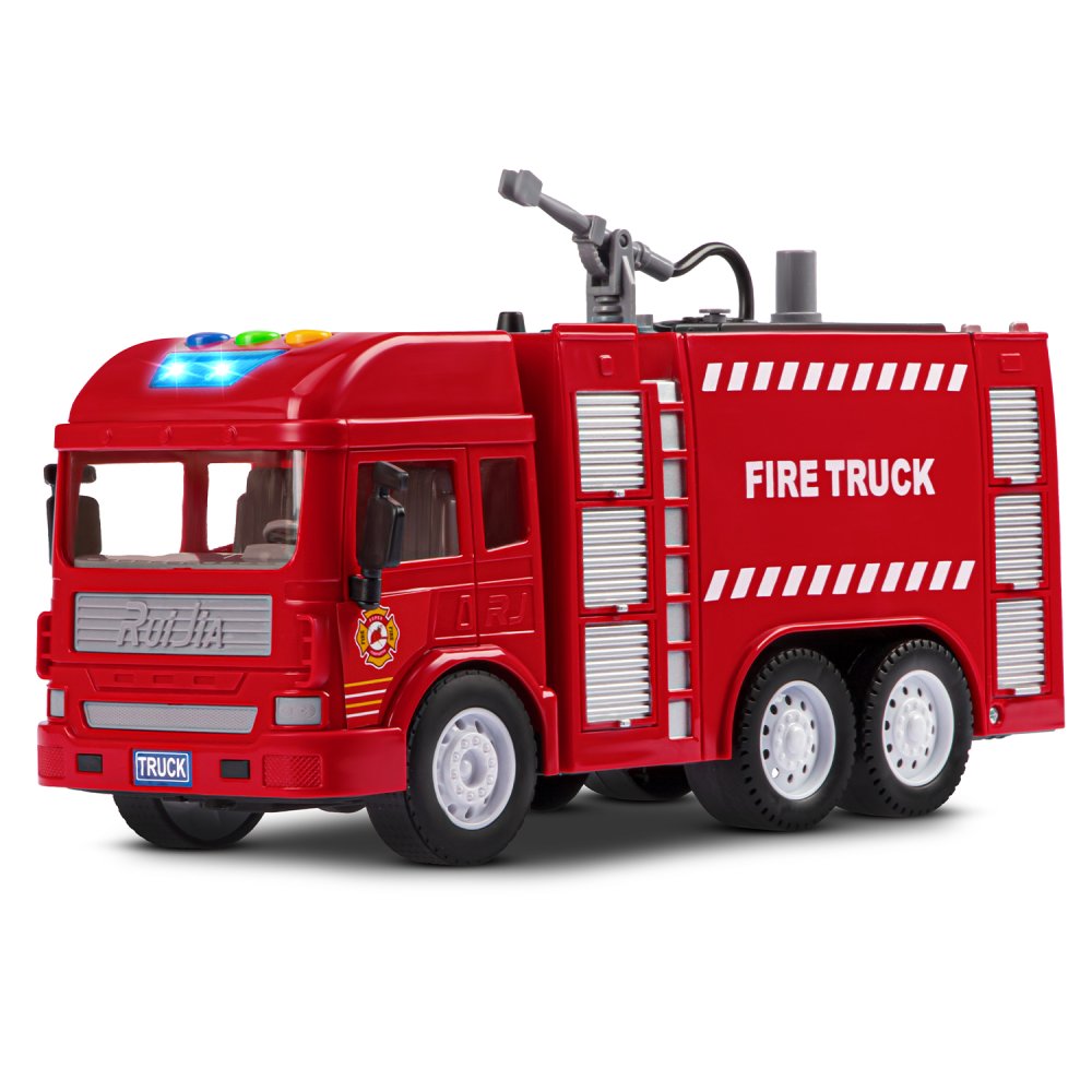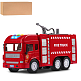 Фрикционная пожарная машина на батарейках выглядит очень реалистично, а световые и звуковые эффекты сделают игровой процесс еще более увлекательным. Также машина стреляет водой, если её предварительно залить в специальную емкость машинки.