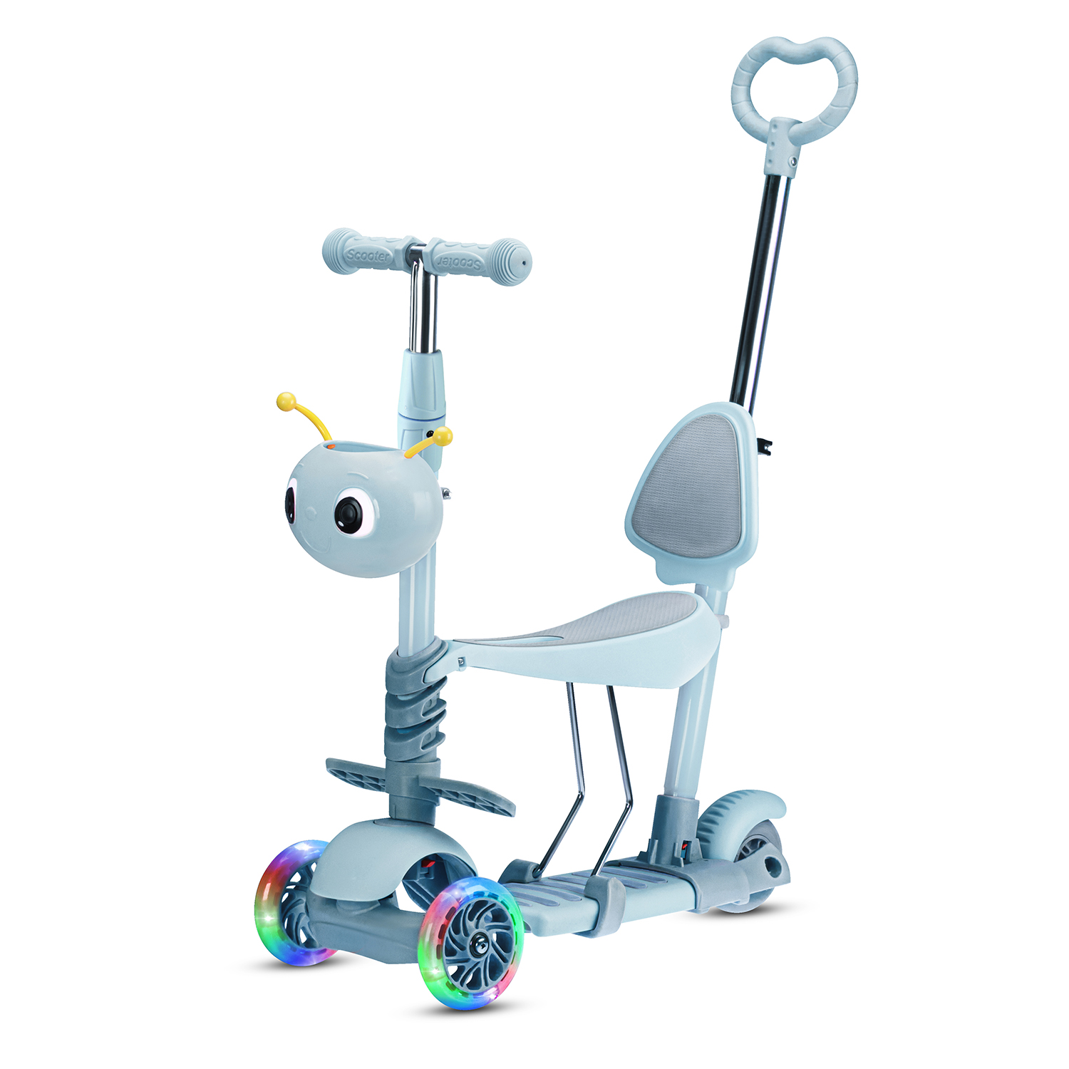 Трехколесный самокат-беговел CITYRIDE 3в1. в/к. Колеса PU 120/95, передние LED свет. Ручка - сталь, корзина, дека сиденье PP материал. Ручка управления. С корзиной в светлый голубой цвет