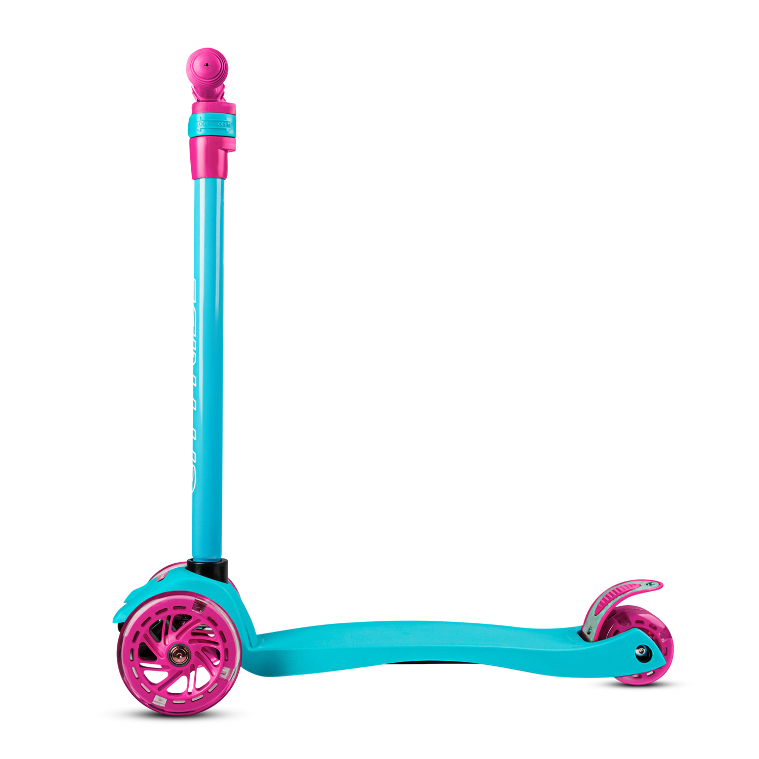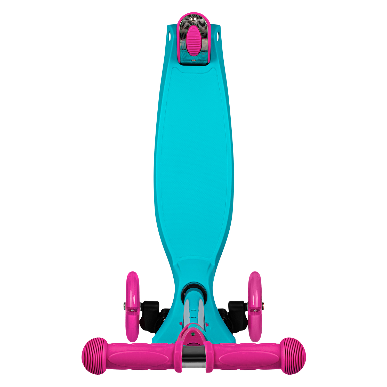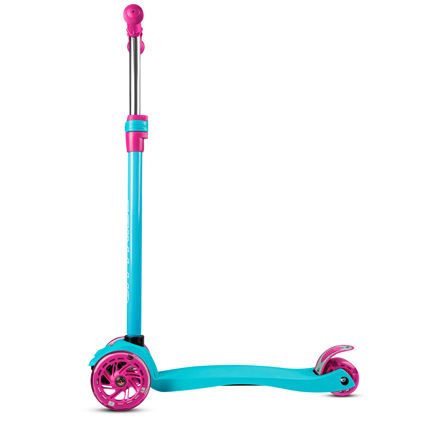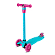 Продуманное расположение колёс с подсветкой, создает идеальную устойчивость: два передних колеса диаметром 120 мм обеспечивают плавный ход, а сдвоенные задние колеса диаметром 76 мм гарантируют надежную поддержку и маневренность.