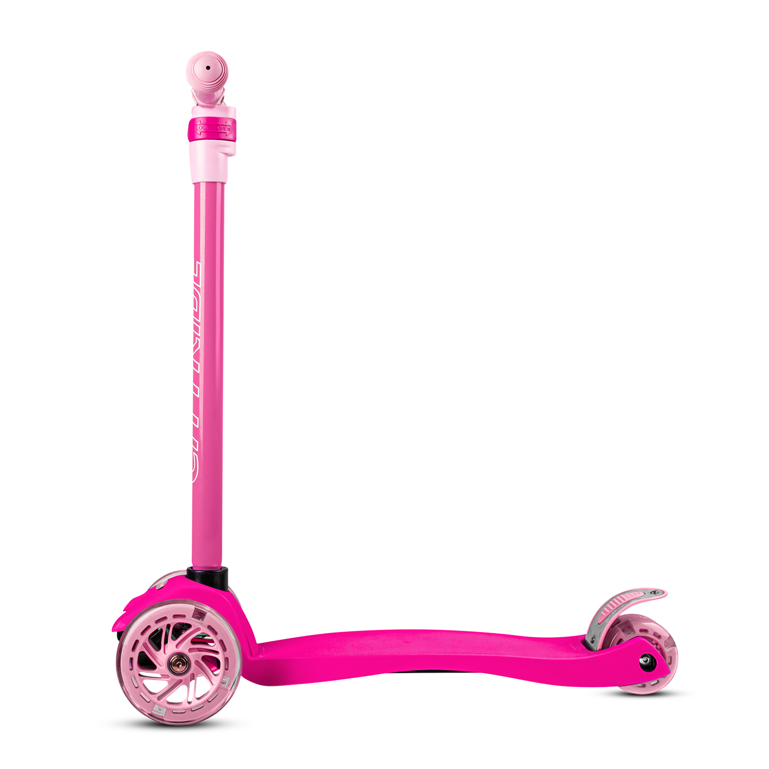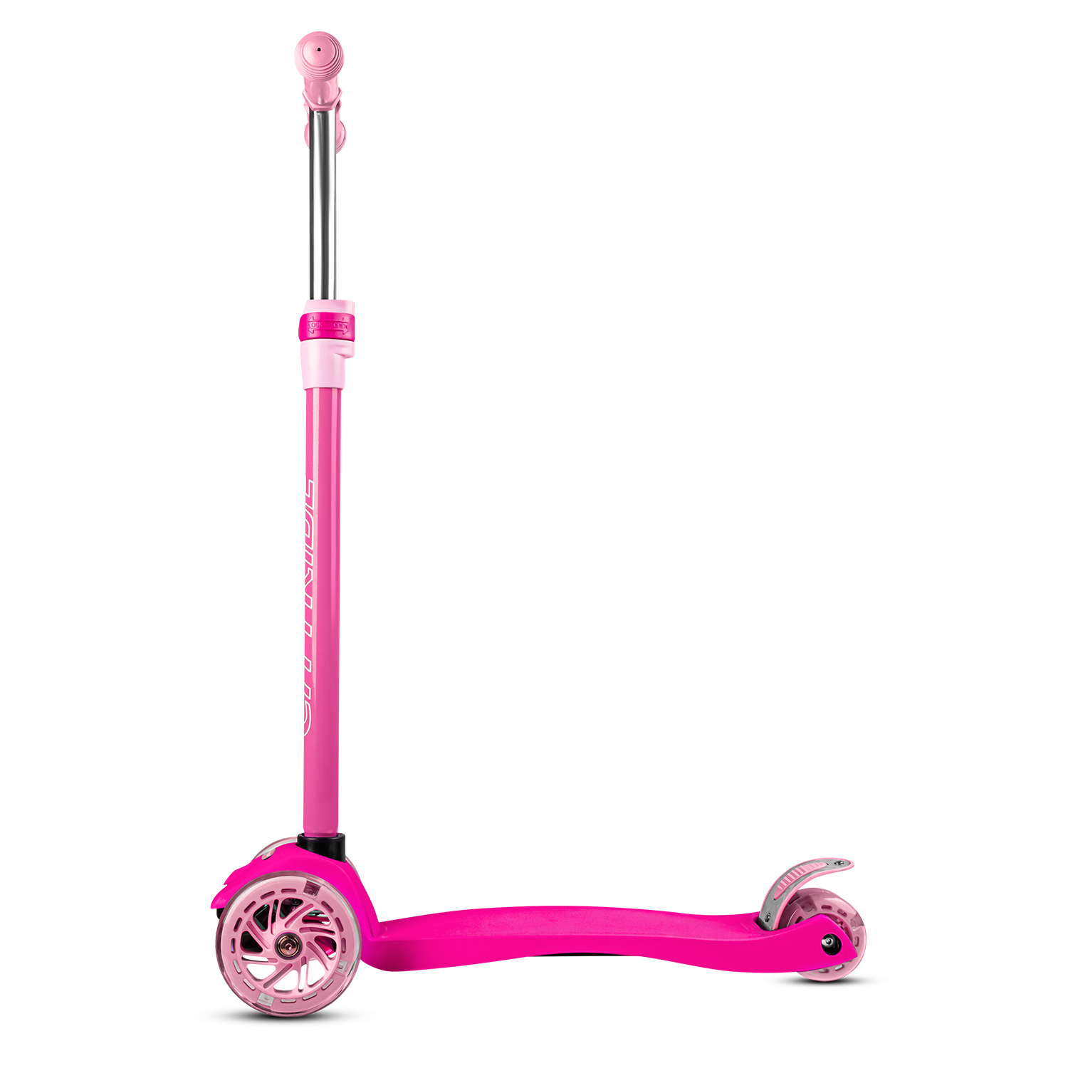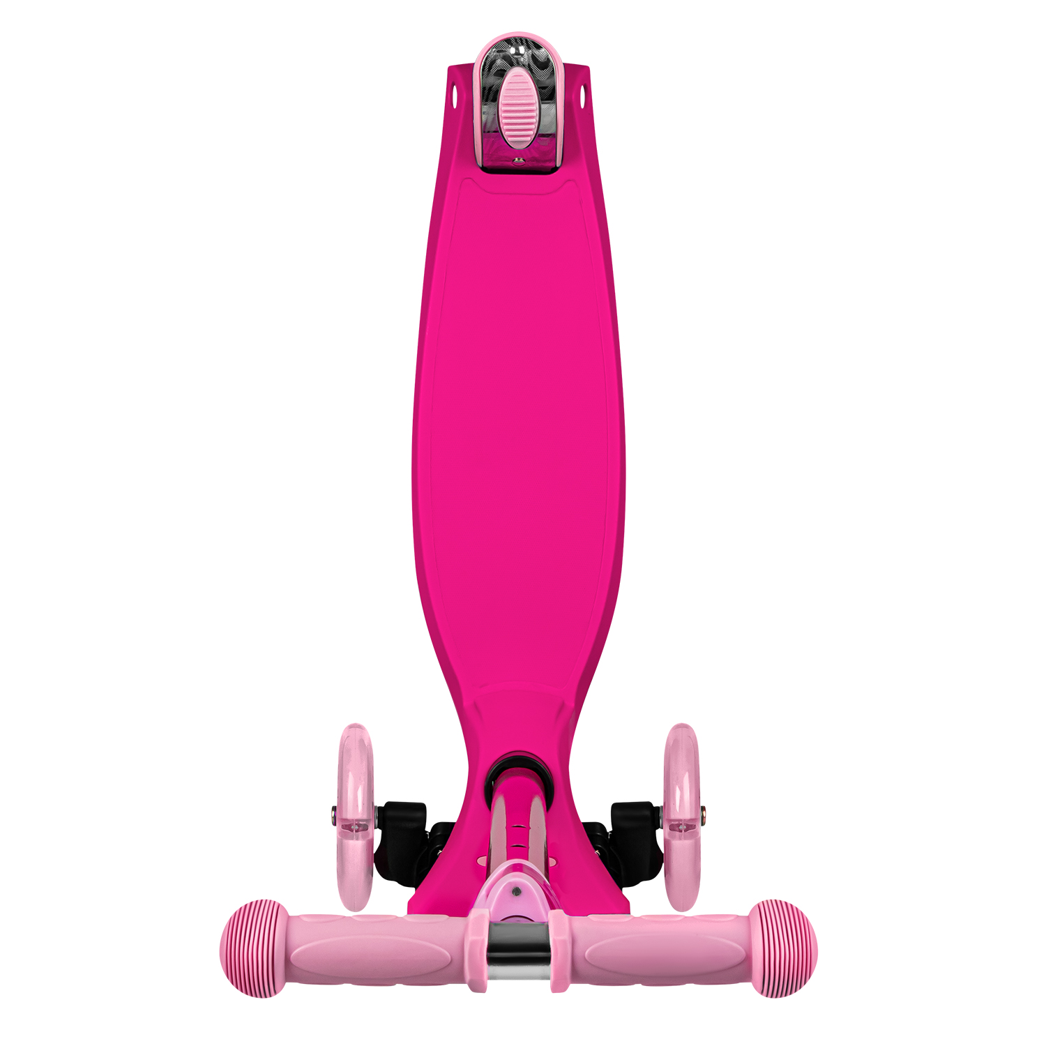 Продуманное расположение колёс с подсветкой, создает идеальную устойчивость: два передних колеса диаметром 120 мм обеспечивают плавный ход, а сдвоенные задние колеса диаметром 76 мм гарантируют надежную поддержку и маневренность.