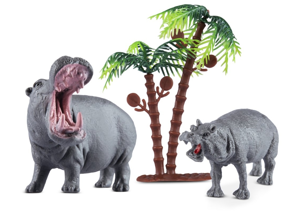 В набор входят: бегемот 10 х 7,5 см, бегемотик 8,5 х 4 см, пальма 9 х 10 см.