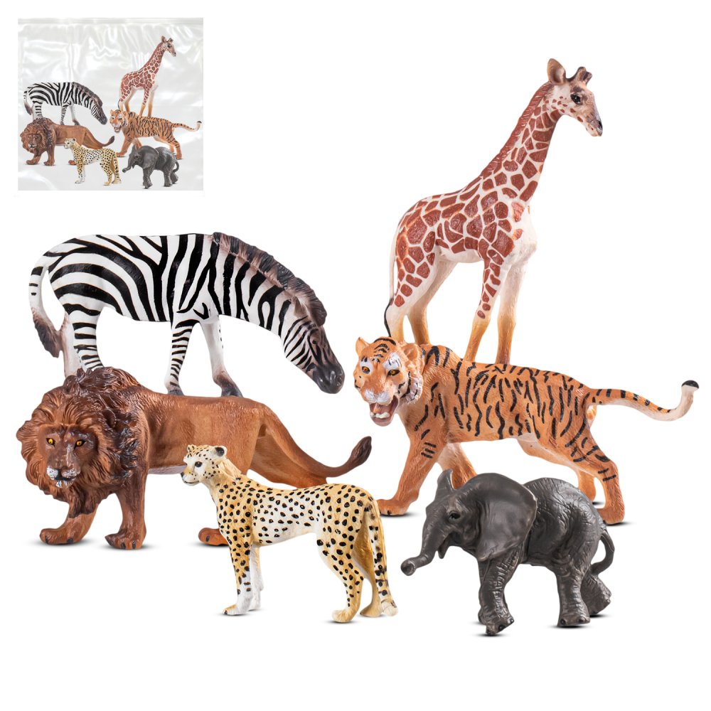В набор "Животные Африки" входят: зебра - ~ 12 см, лев -~ 13 см, тигр - ~ 12 см, слонёнок - ~ 9 см, жираф -~ 12,5 см, леопард -~ 8 см.