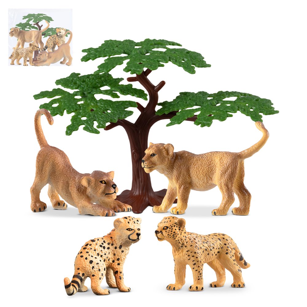 В набор "Животные Африки: детёныши" входят: детёныши гепарда -~ 5 - 5,5 см, львята - ~ 6,5 см, дерево - ~ 11 см .