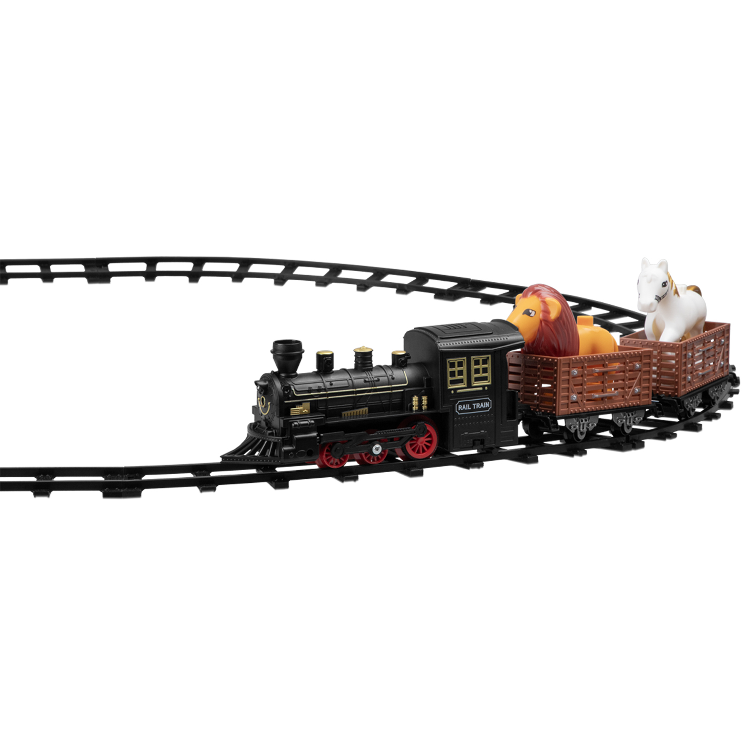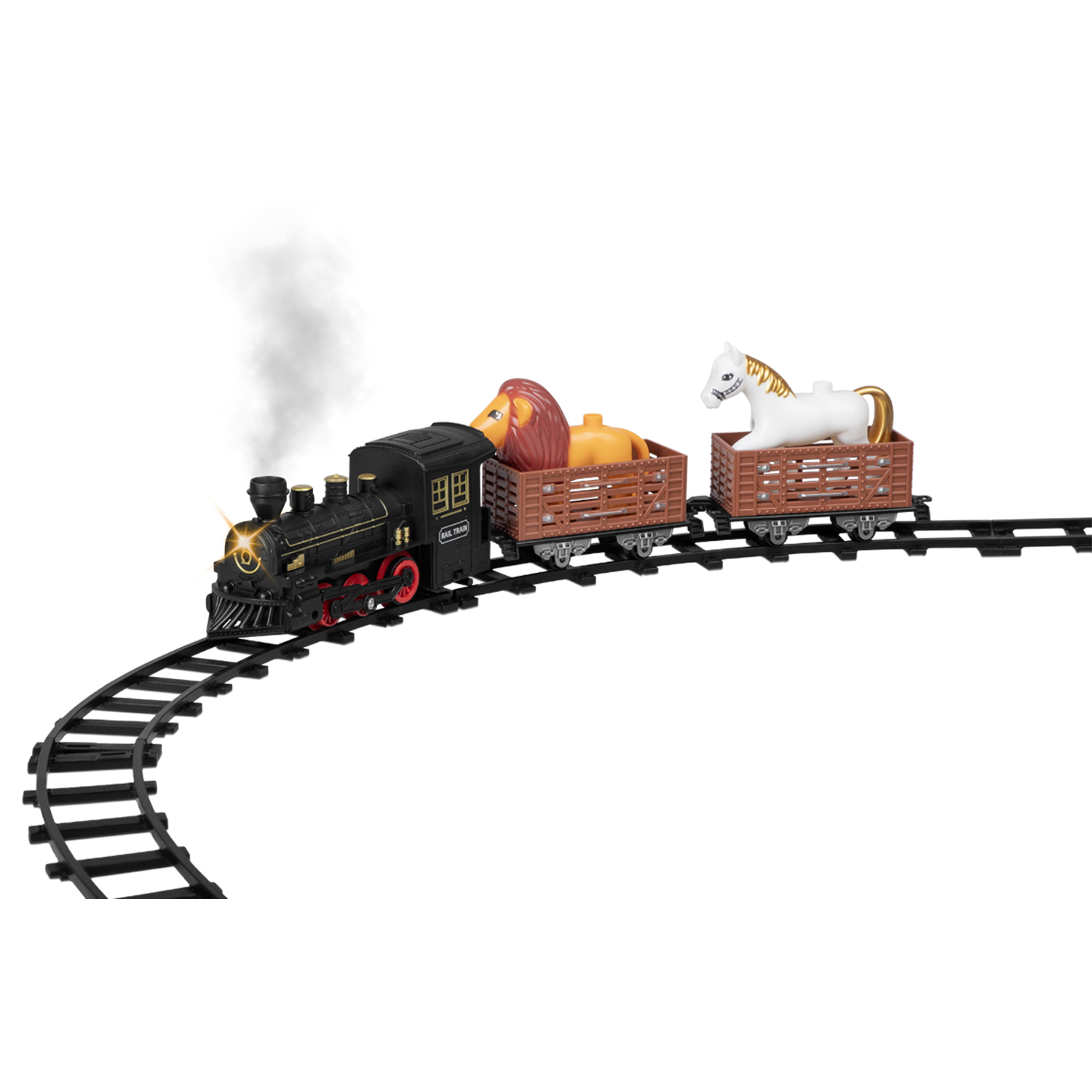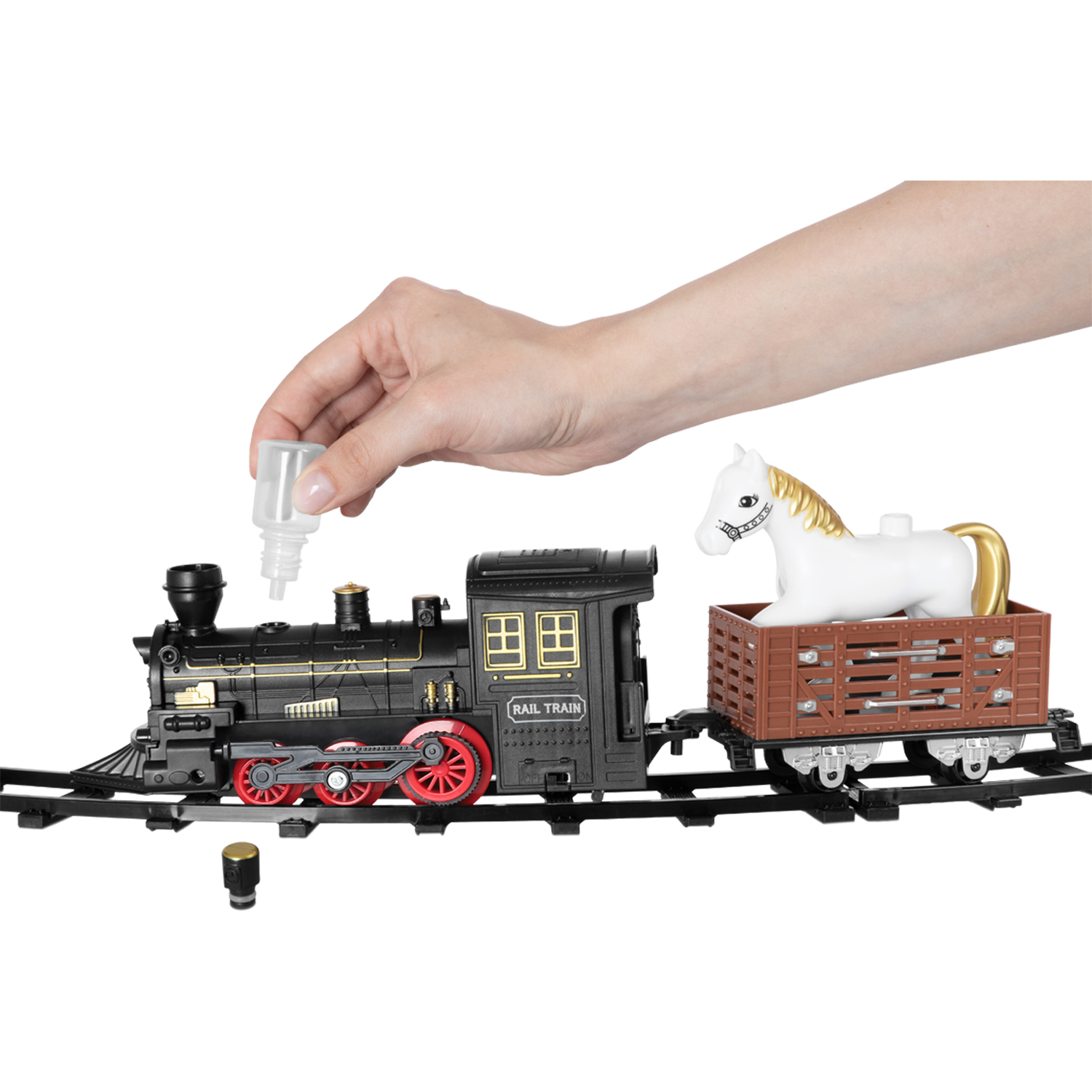 Прежде чем отправиться в увлекательное путешествие, ребёнку предстоит собрать железную дорогу из множества деталей. Когда путь будет готов, можно запускать поезд. Во время движения он издаёт реалистичные световые и звуковые эффекты, имитирующие гудок и звуки движущегося железнодорожного состава. А если залить воду в специальный отсек, локомотив начнёт выпускать безопасный пар, создавая иллюзию настоящего дыма.
