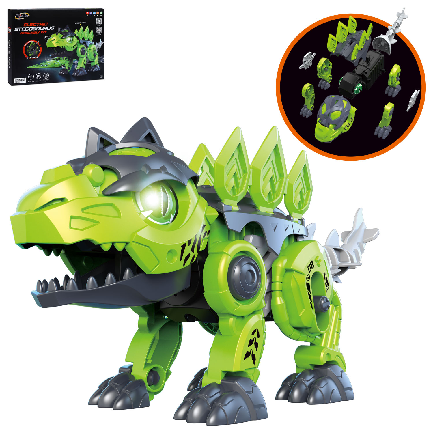 С помощью инструкции из комплекта ребёнок соберет уникальную модель рободинозавра. Благодаря блоку питания игрушечный динозавр «оживёт»: начнёт ходить, двигать хвостом и челюстями, издавать реалистичный рёв динозавра. Конструктор «Динозавр» также обладает и световыми эффектами; подсветка глаз особенно эффектно смотрится в темноте.