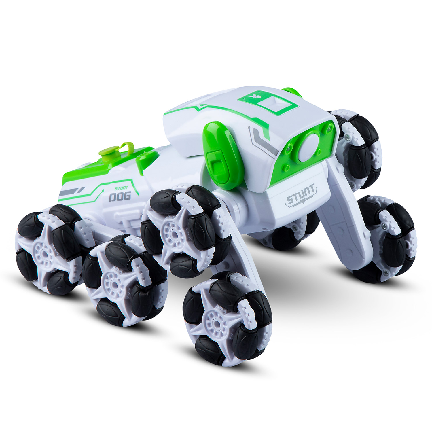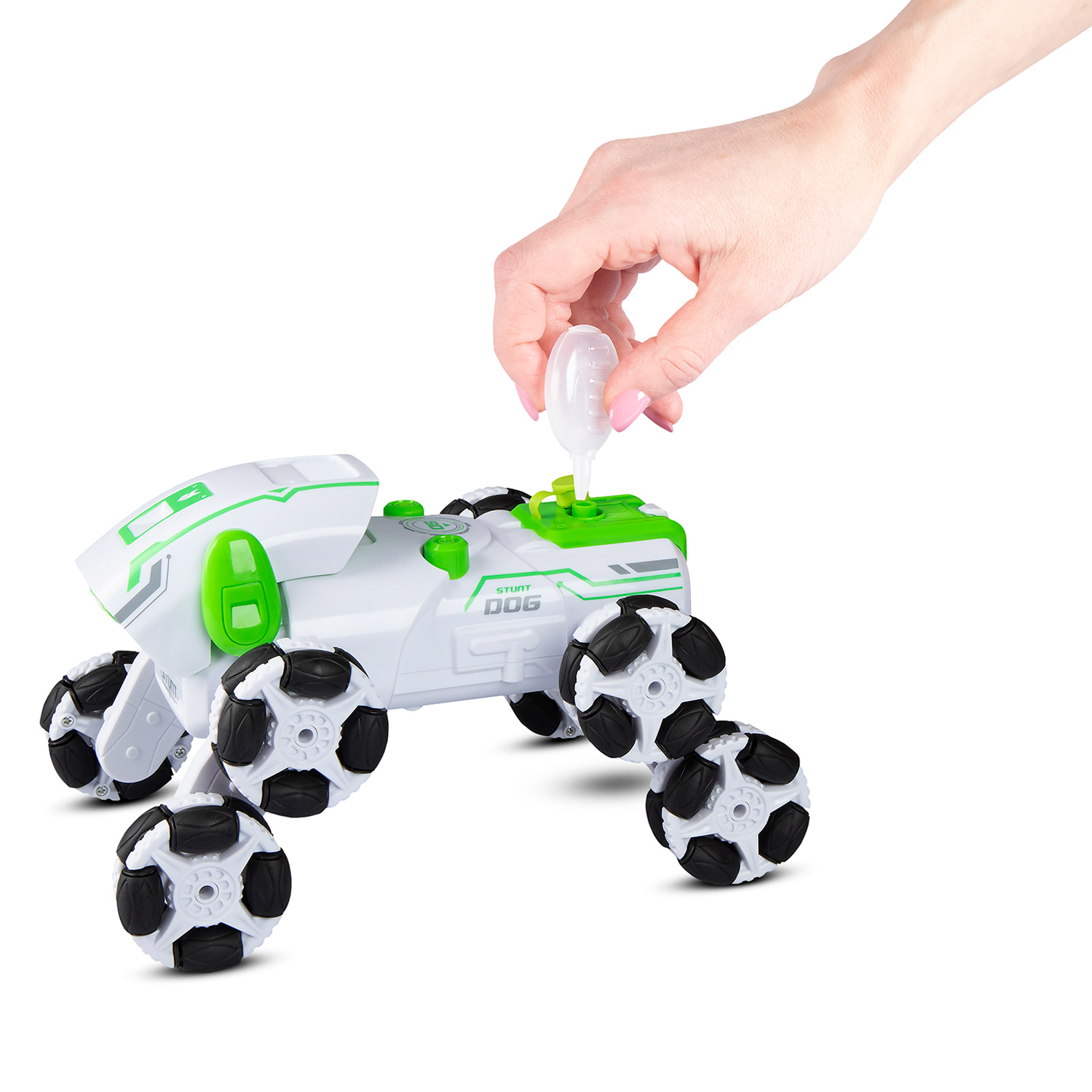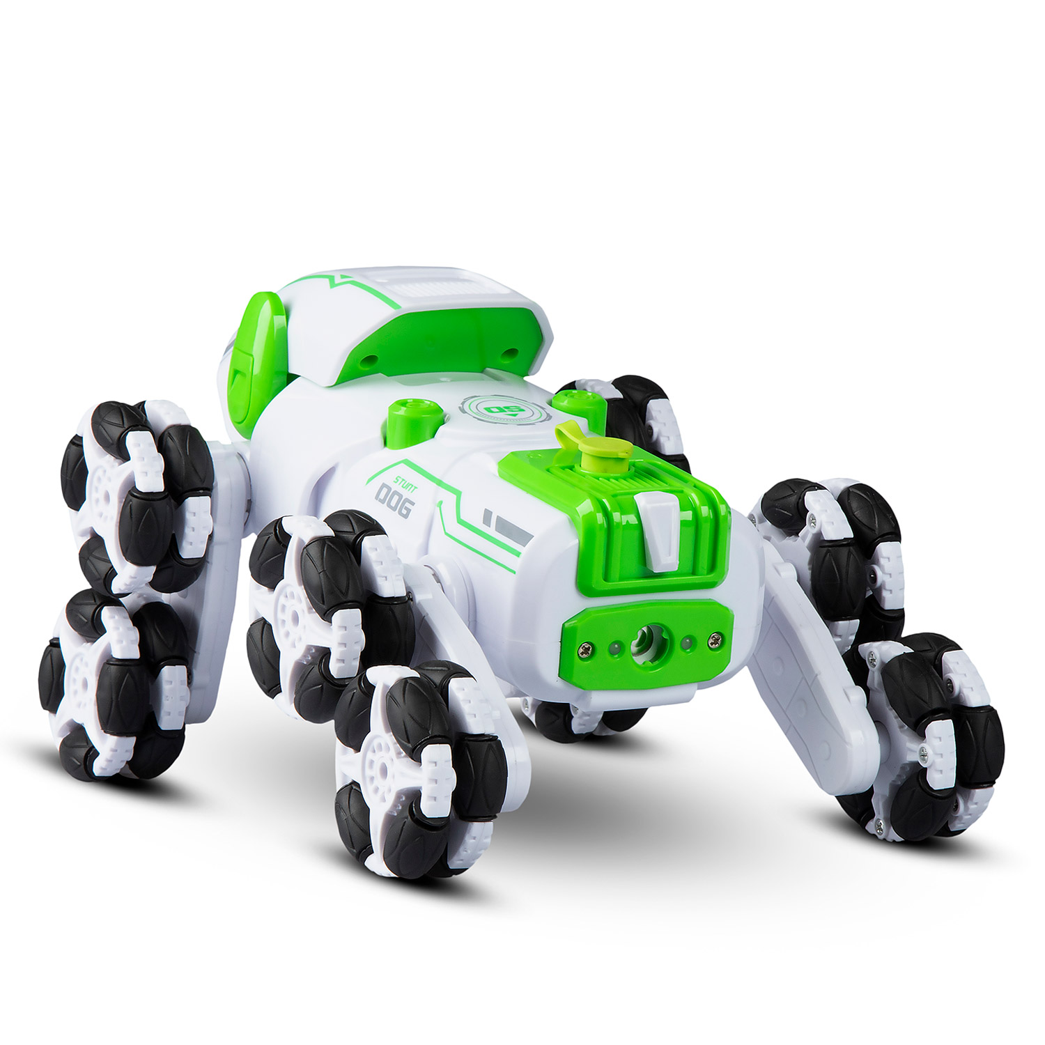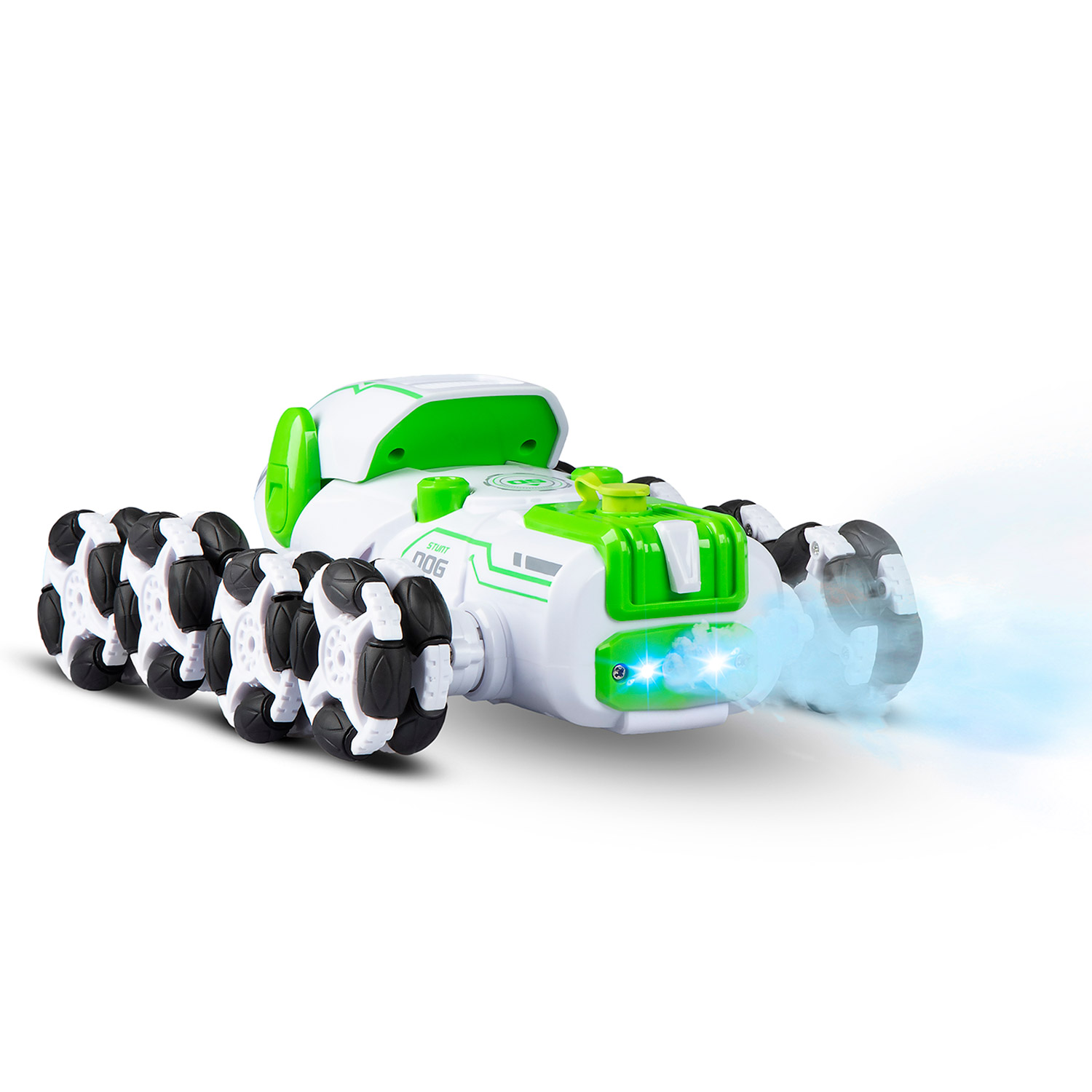 Робот-перевёртыш в виде собаки оснащён инновационными колёсами, в протекторы которых встроены ролики, позволяющие игрушке двигаться в любых направлениях, в том числе разворачиваться на 360 градусов и вращаться на месте. Колесные пары игрушки предполагают возможность вращения по оси, таким образом вы можете регулировать высоту стойки робопса. Ещё одной удивительной особенностью игрушки является функция пара, для активации которой нужно снять заглушку отверстия на верхней части корпуса и залить туда воду с помощью специальной ёмкости из комплекта. Пуск пара активируется нажатием соответствующей кнопки на пульте управления, пар не нагревается и абсолютно безопасен для детей.