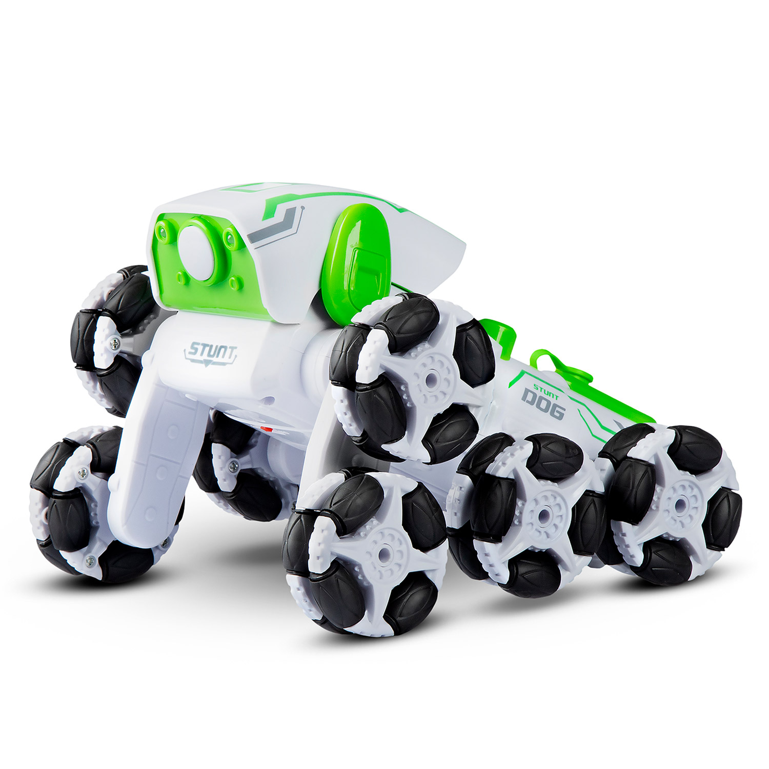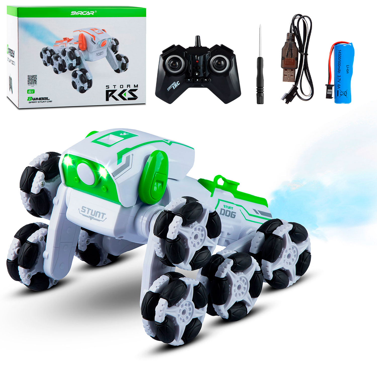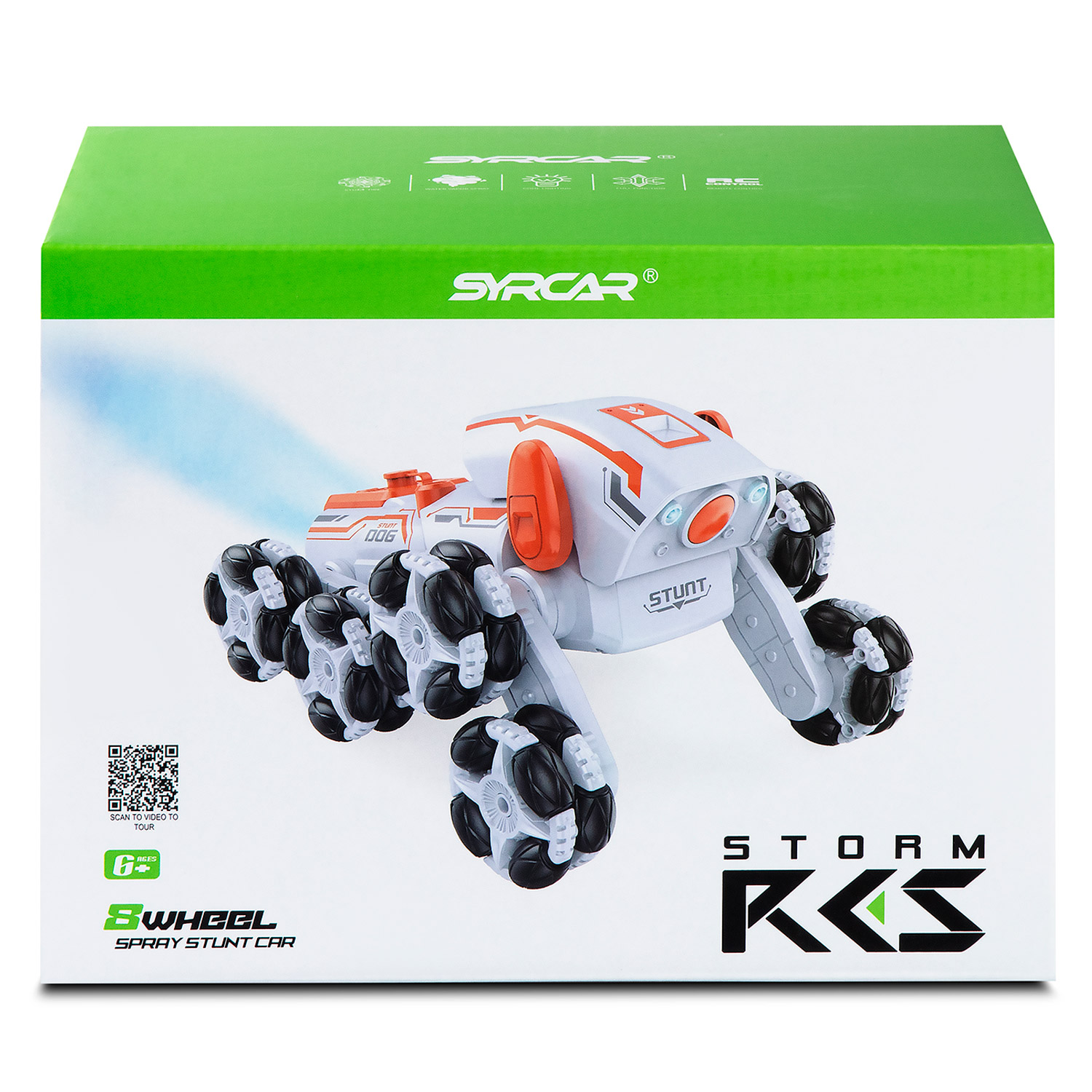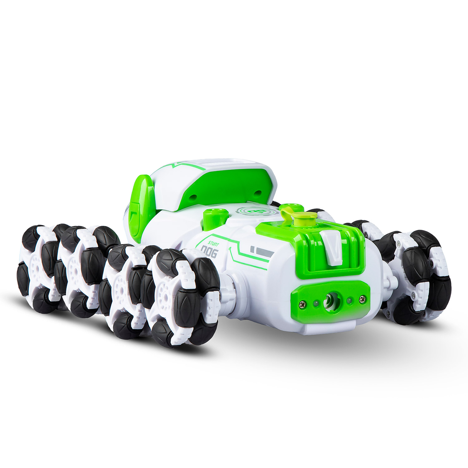 Робот-перевёртыш в виде собаки оснащён инновационными колёсами, в протекторы которых встроены ролики, позволяющие игрушке двигаться в любых направлениях, в том числе разворачиваться на 360 градусов и вращаться на месте. Колесные пары игрушки предполагают возможность вращения по оси, таким образом вы можете регулировать высоту стойки робопса. Ещё одной удивительной особенностью игрушки является функция пара, для активации которой нужно снять заглушку отверстия на верхней части корпуса и залить туда воду с помощью специальной ёмкости из комплекта. Пуск пара активируется нажатием соответствующей кнопки на пульте управления, пар не нагревается и абсолютно безопасен для детей.